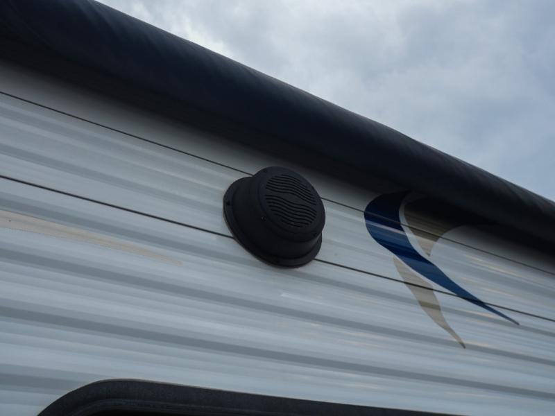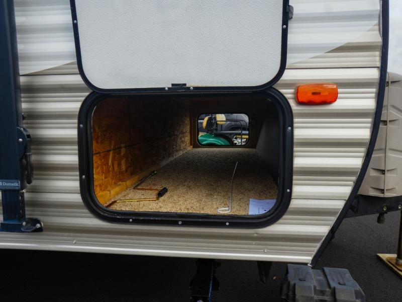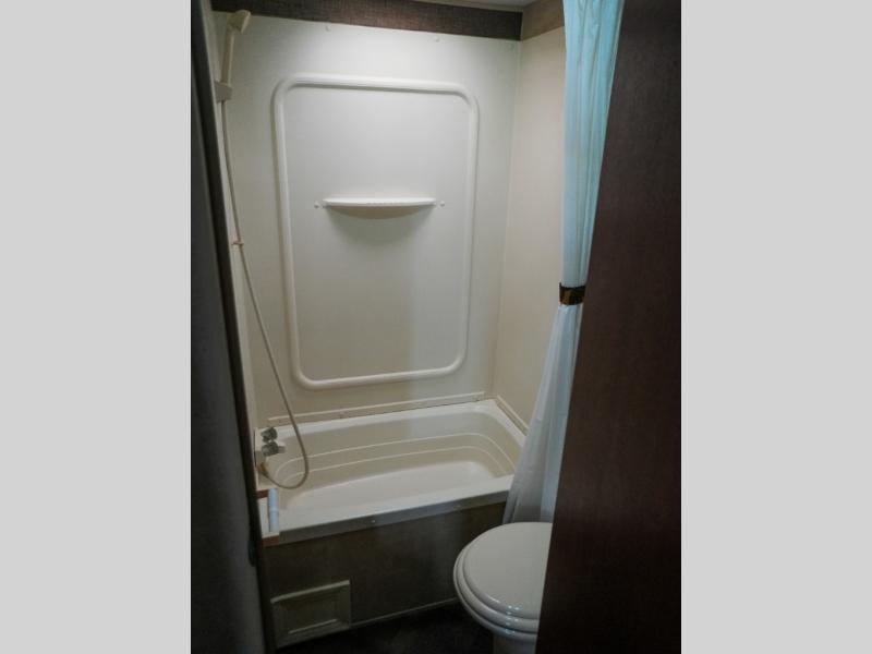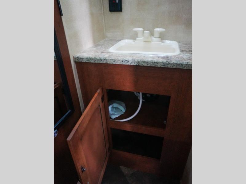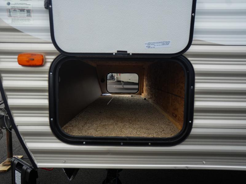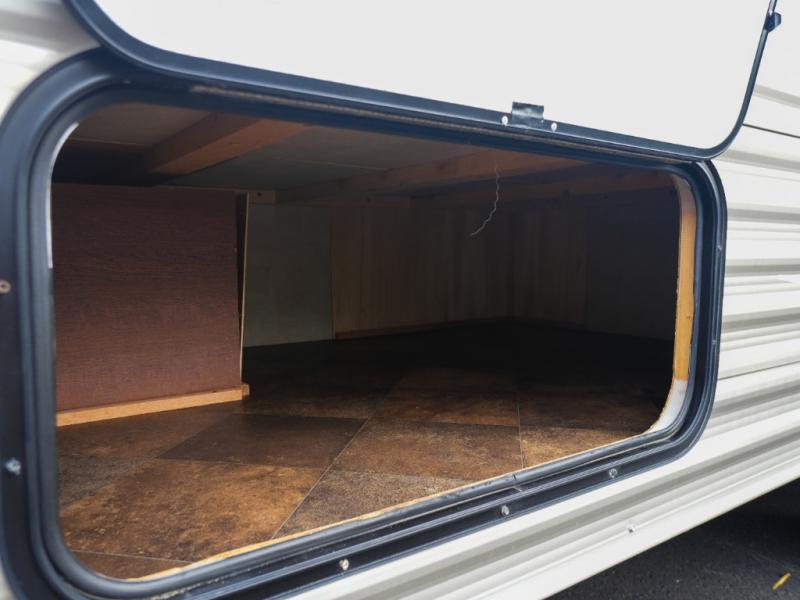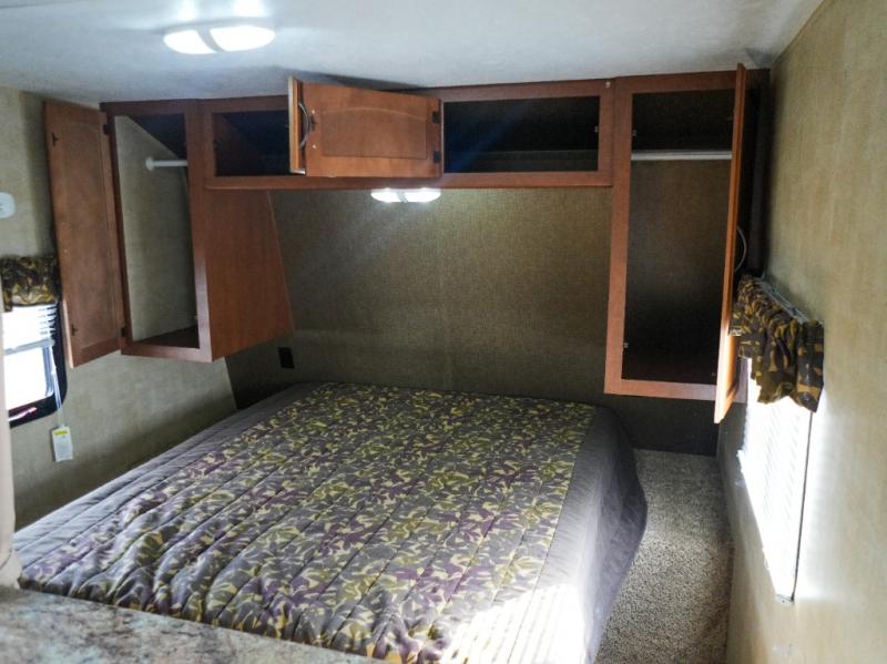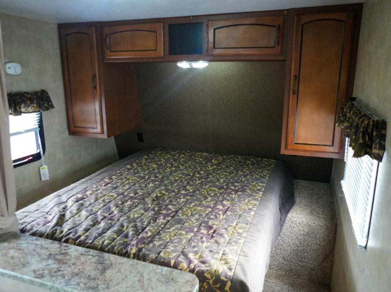Just inside the entry door you will notice a front bedroom to your right. There is a queen size bed with closets on either side and overhead cabinets for added storage. You will also enjoy the front pass-through compartment which is located beneath the queen bed and it can be accessed from either side of the trailer.