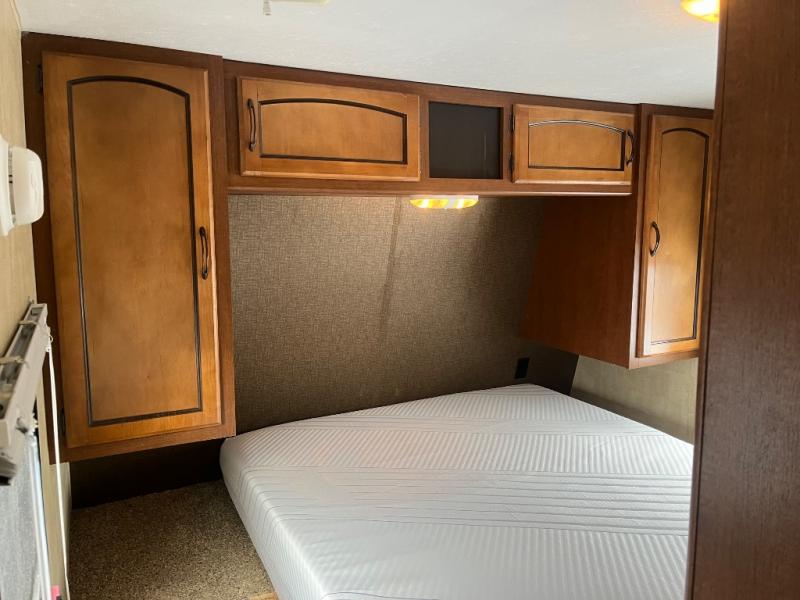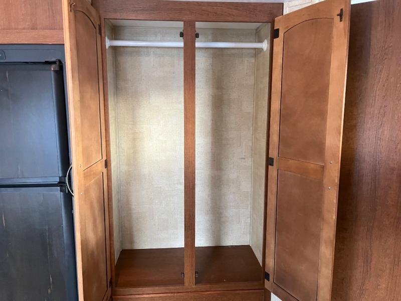 Step into the front most entry door and see an entertainment center with curtains on either side to the right. The front bedroom features a queen size bed, closets on both sides of the bed, and an overhead cabinet. The curtains can be pulled for a bit more privacy at night.