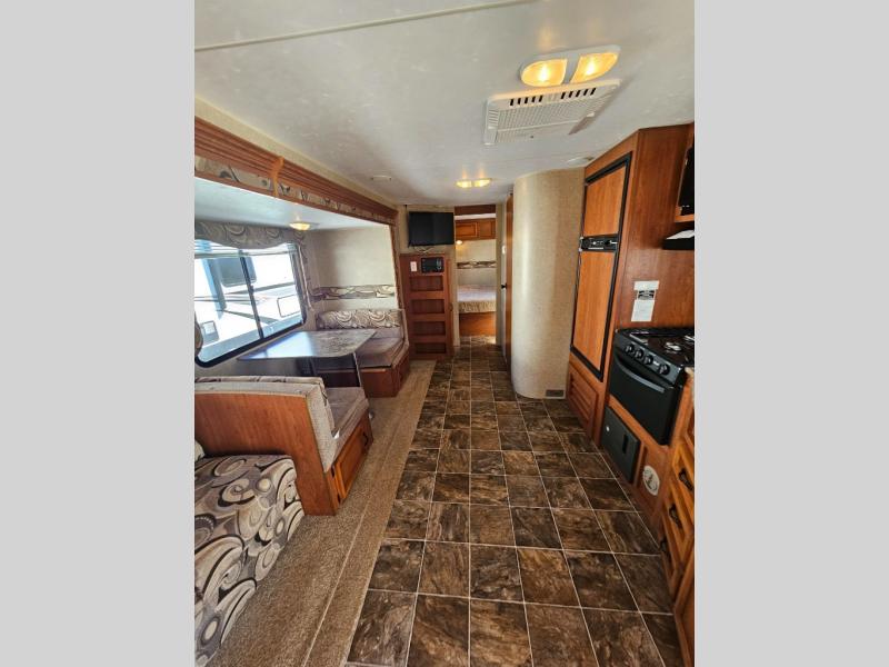 As you enter the rear entrance, there are two lounge chairs along the rear wall. The slide has a sofa and dinette. Next to the dinette you will find a TV outlet/closet. The opposite side of the travel trailer has a double kitchen sink, three burner range, microwave, and refrigerator.