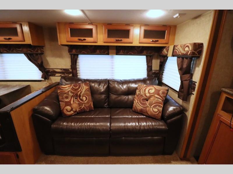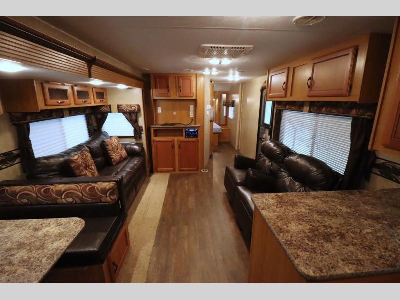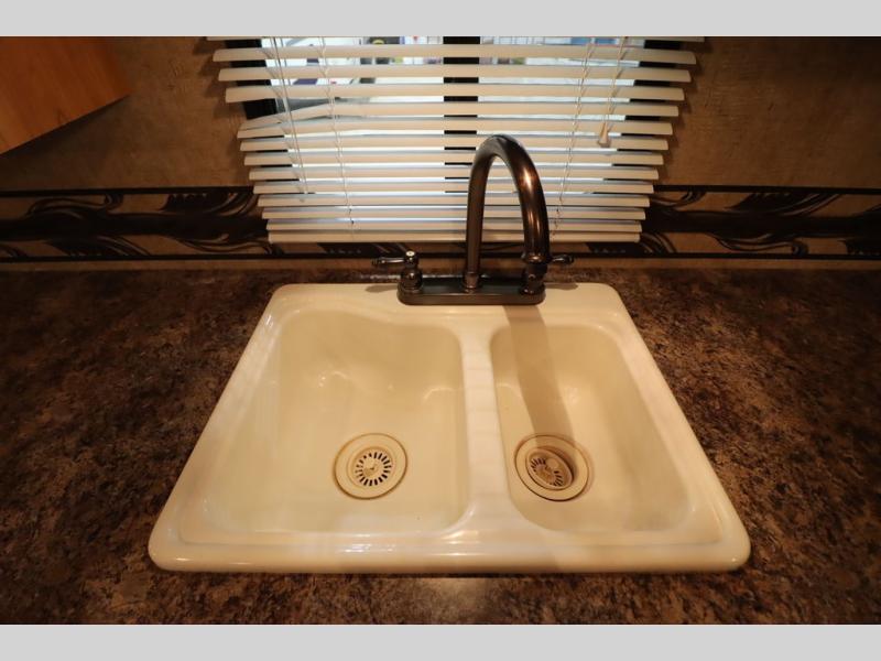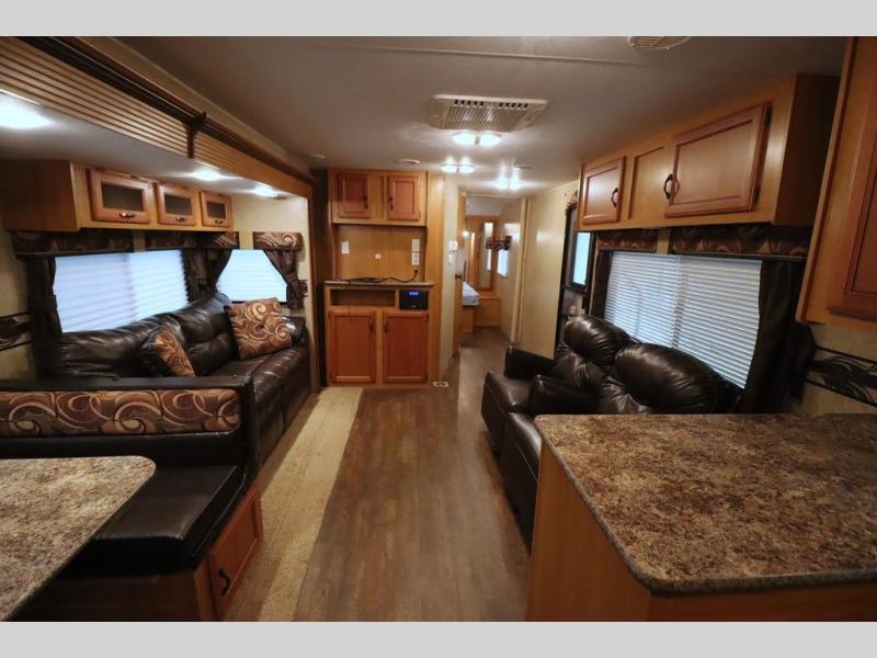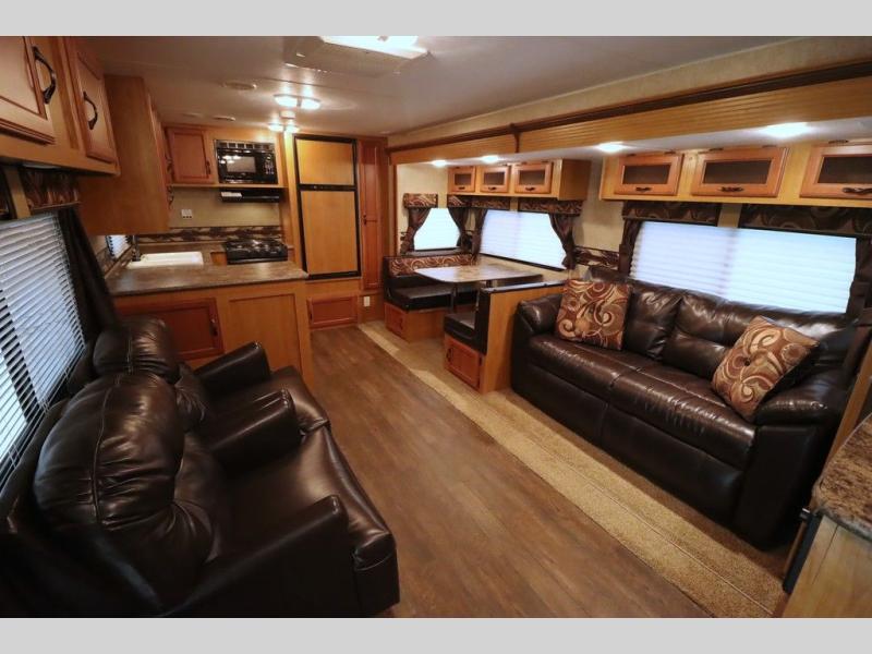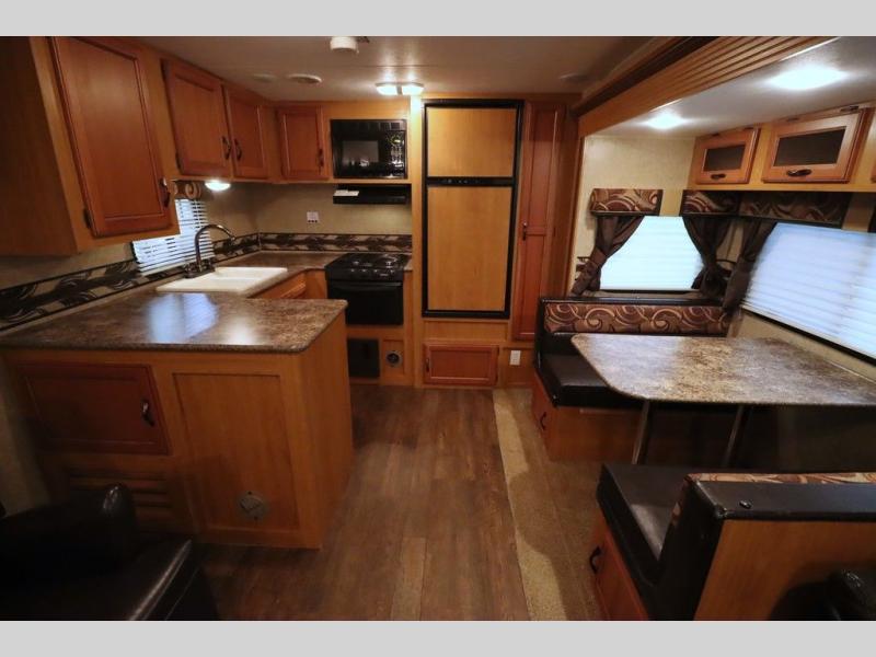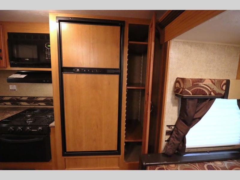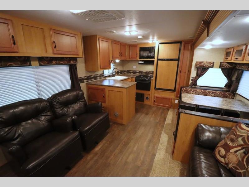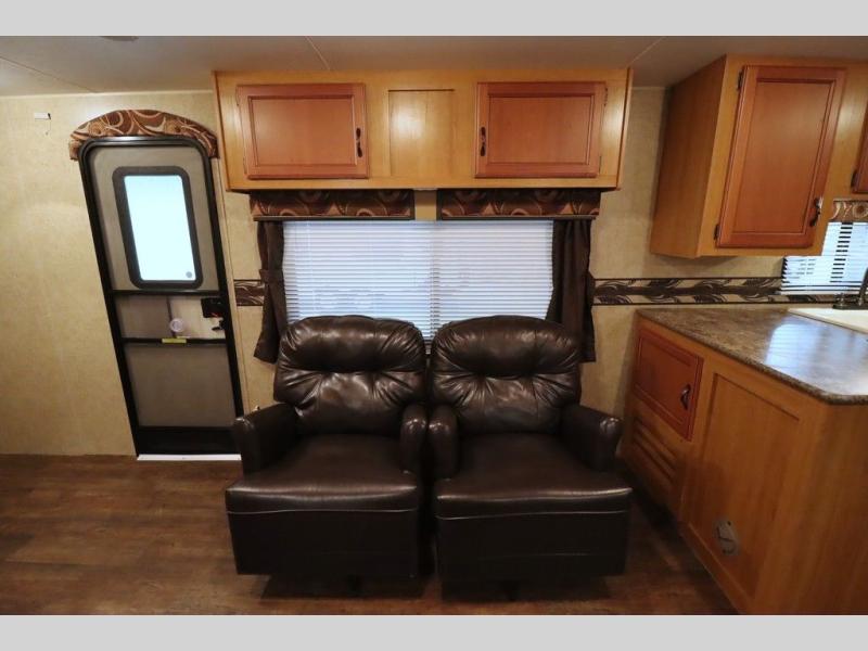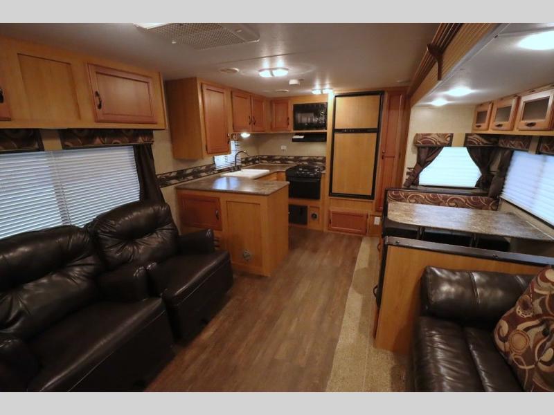 As you enter the model, to your left are two lounge chairs. The kitchen has a wrap around counter with a double kitchen sink. You will also find a three burner range, refrigerator, and pantry. The slide offers a dinette and sofa. You can view the entertainment center from anywhere in the living area and kitchen area of this travel trailer.