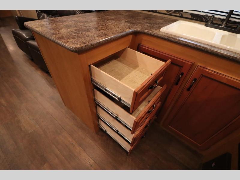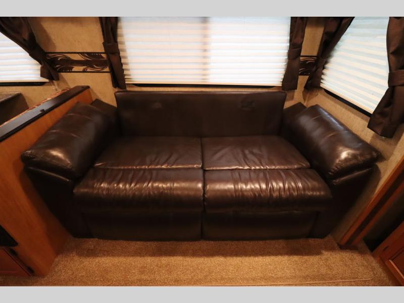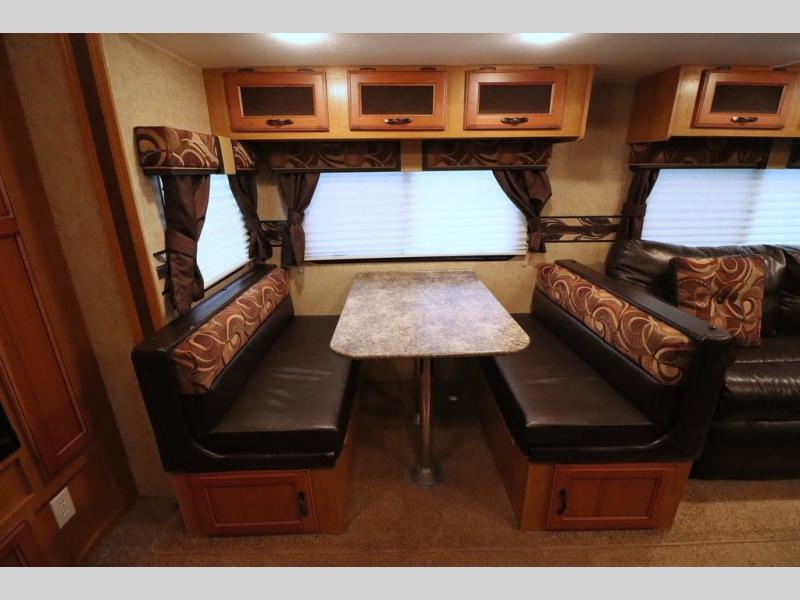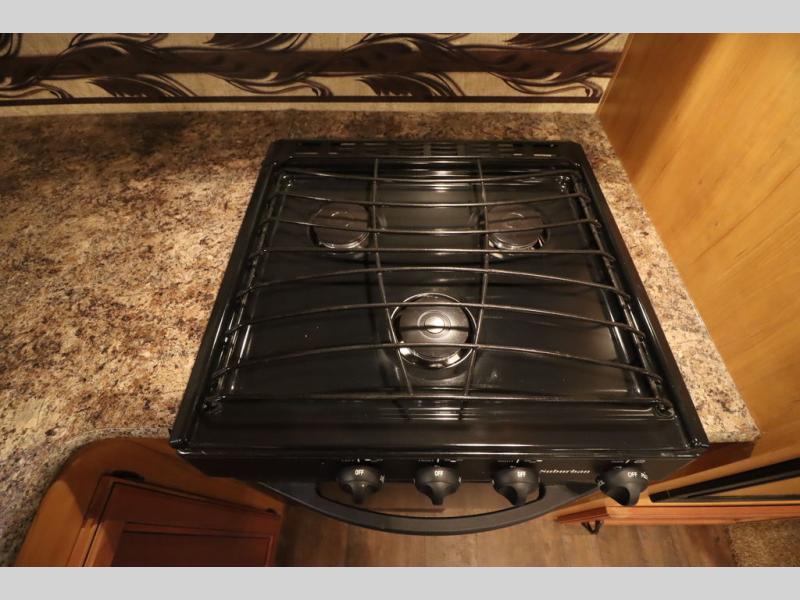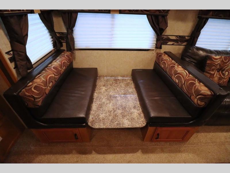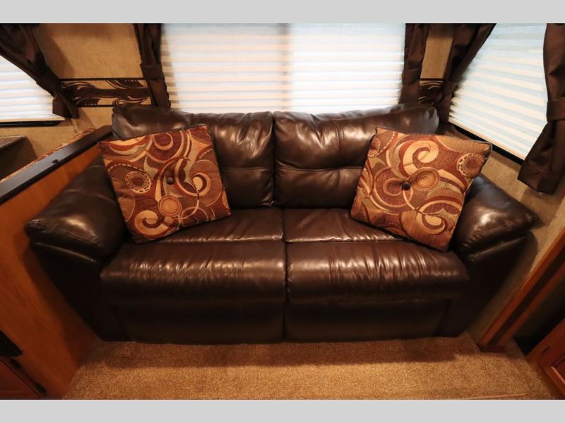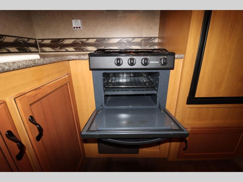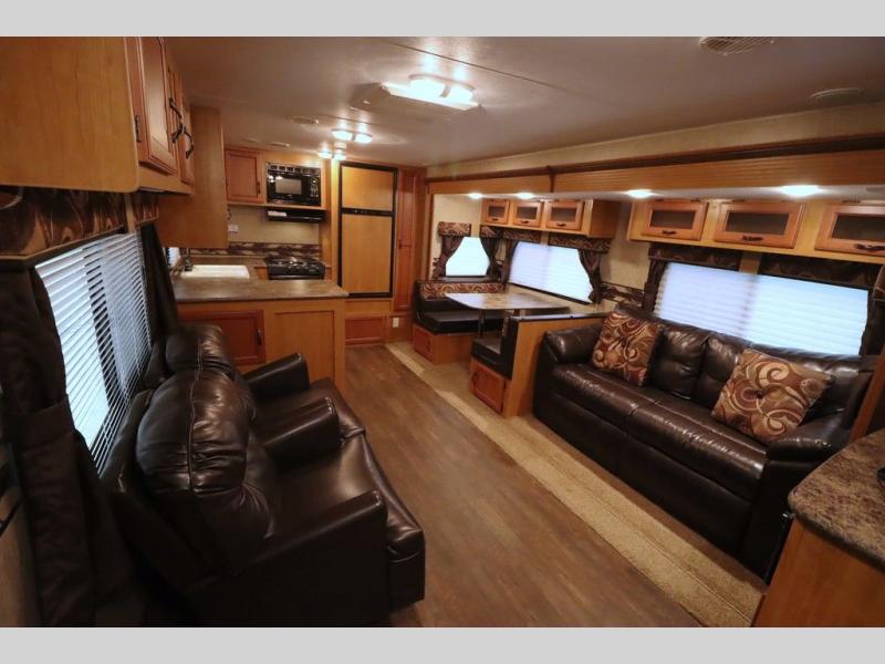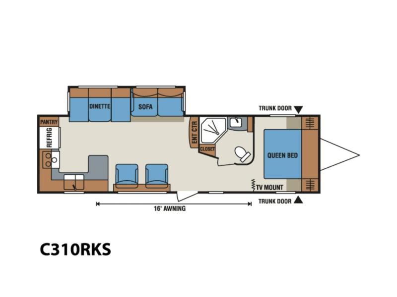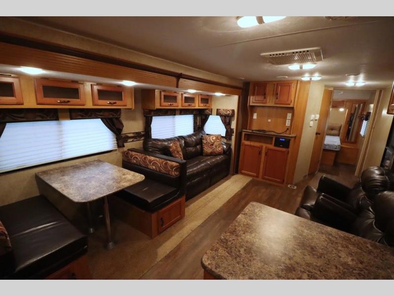 As you enter the model, to your left are two lounge chairs. The kitchen has a wrap around counter with a double kitchen sink. You will also find a three burner range, refrigerator, and pantry. The slide offers a dinette and sofa. You can view the entertainment center from anywhere in the living area and kitchen area of this travel trailer.