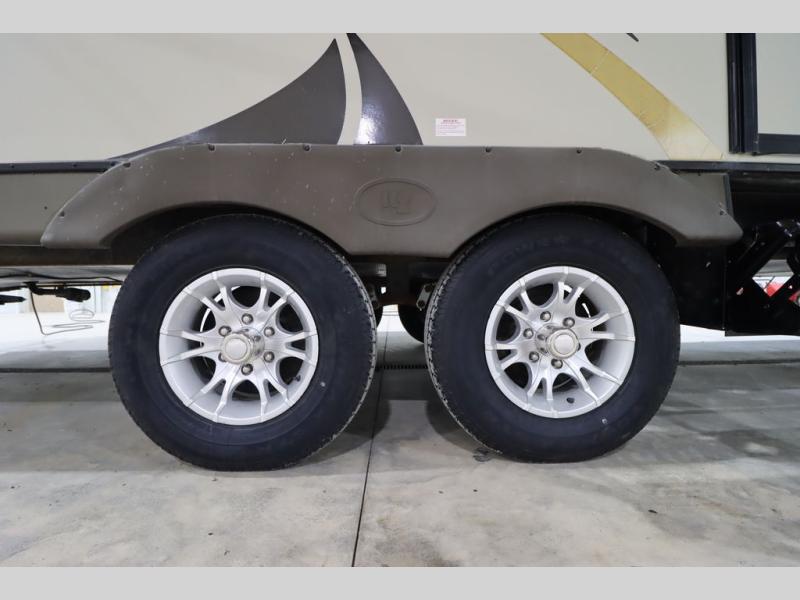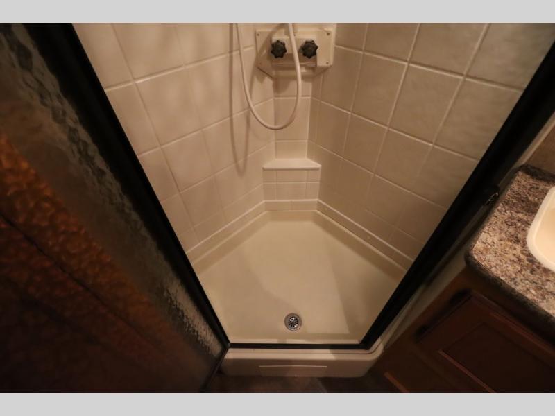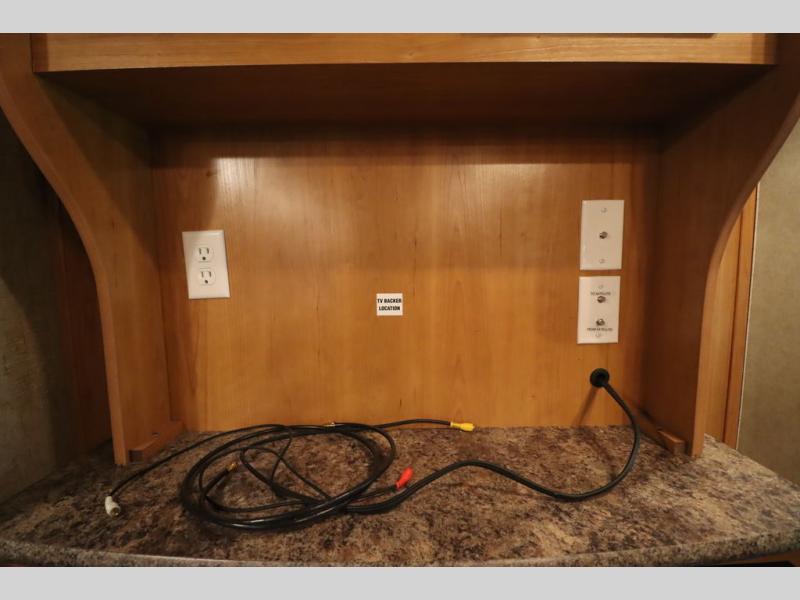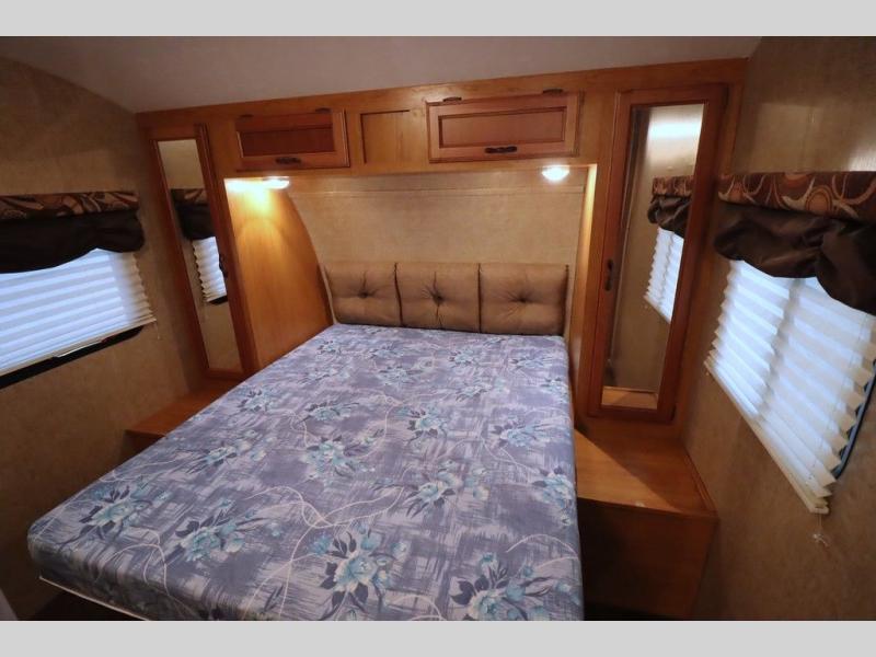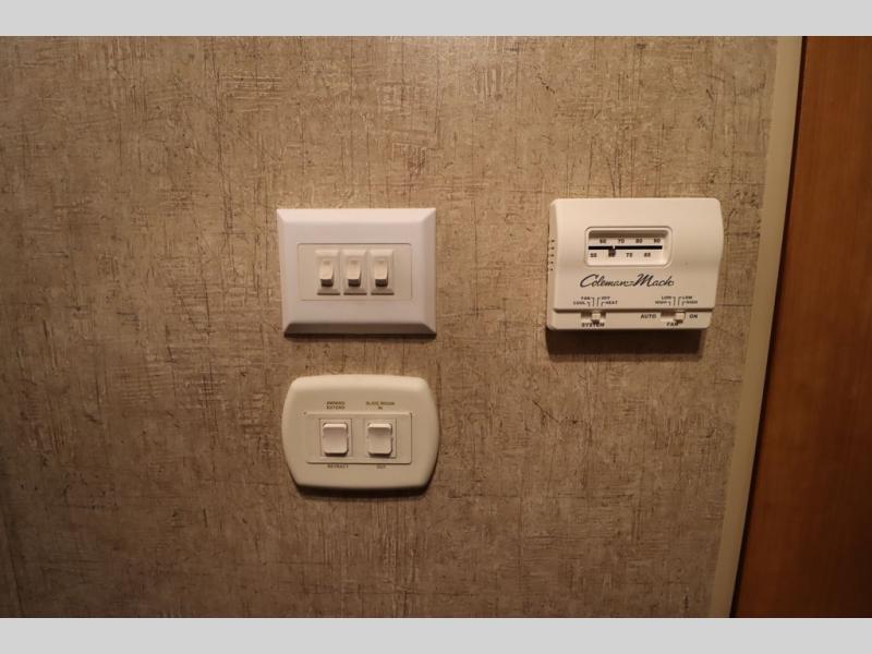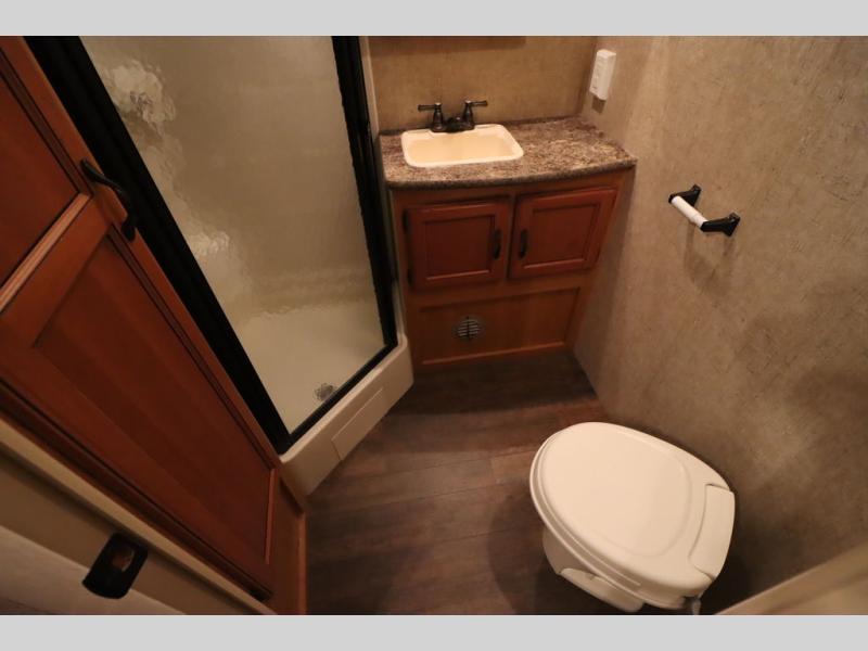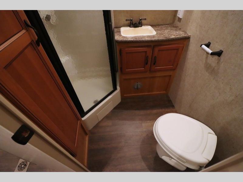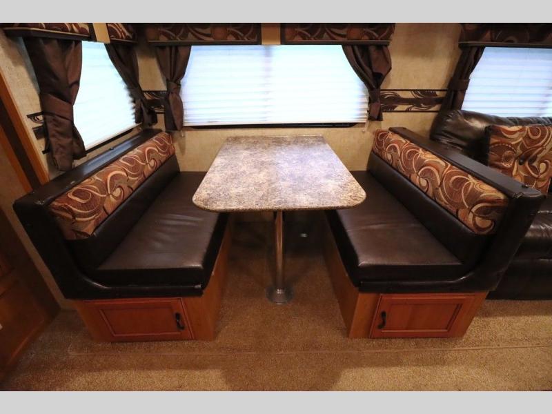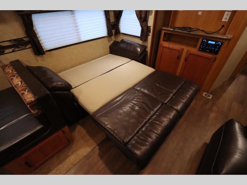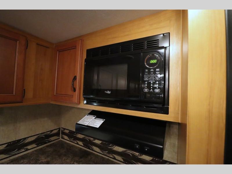 As you enter the model, to your left are two lounge chairs. The kitchen has a wrap around counter with a double kitchen sink. You will also find a three burner range, refrigerator, and pantry. The slide offers a dinette and sofa. You can view the entertainment center from anywhere in the living area and kitchen area of this travel trailer.