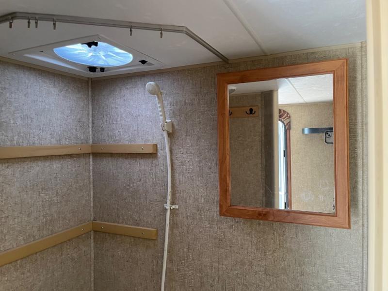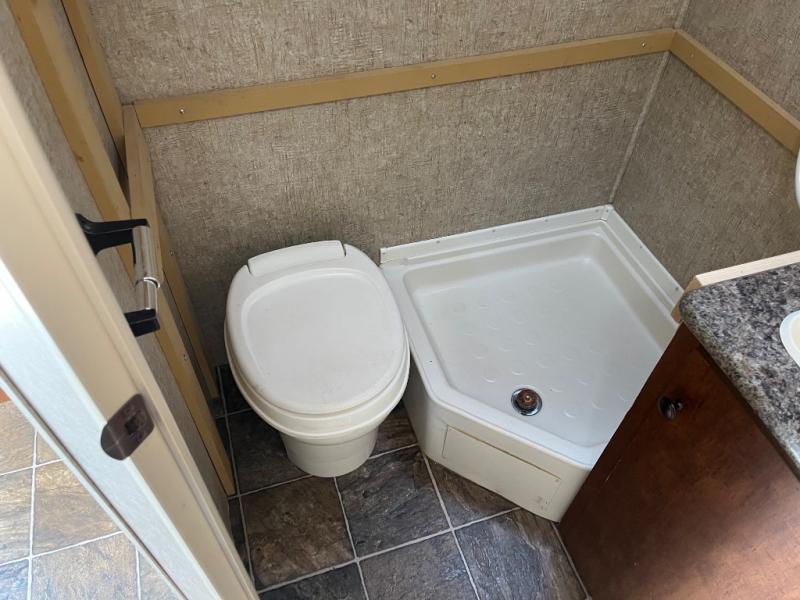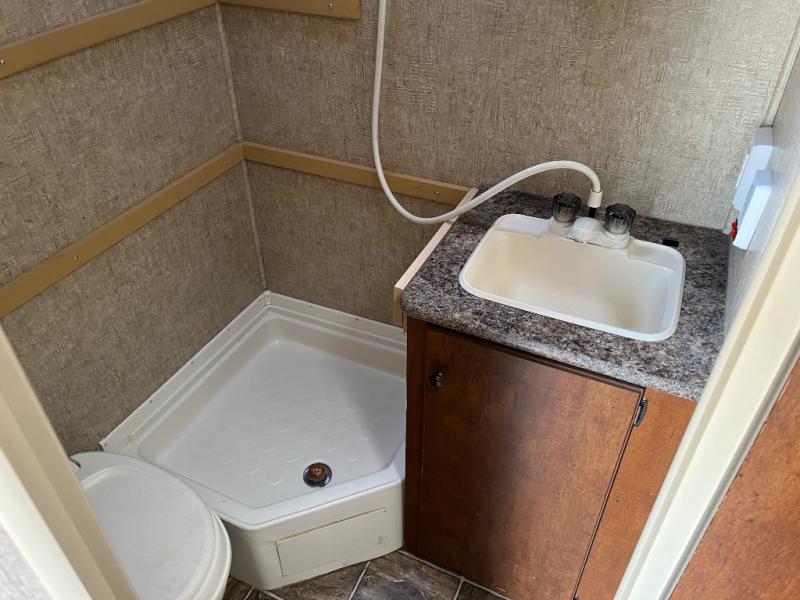 As you enter the expandable, in the rear you will find the bathroom. Inside the bathroom there is a toilet, corner shower, and sink.
