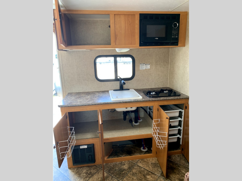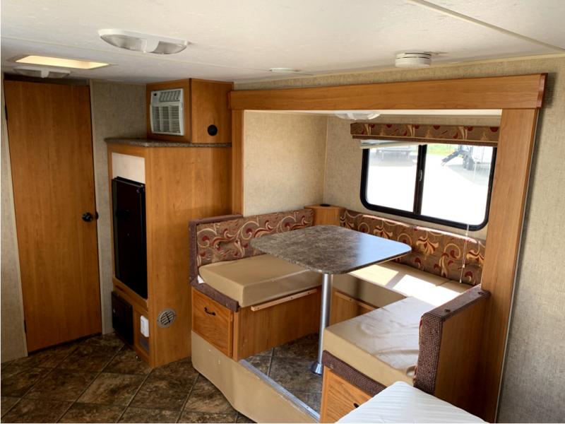 As you enter the travel trailer, to the left is a double kitchen sink and a two-burner range. On the opposite side of the kitchen, you will find a refrigerator beside the large U-Shape dinette.
