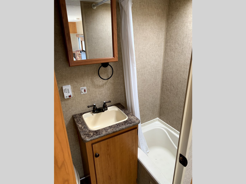 The full bathroom is located in the rear. With shower, sink, toilet, and wardrobe.