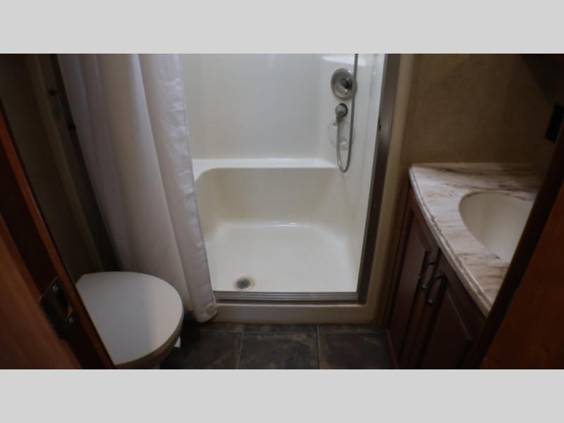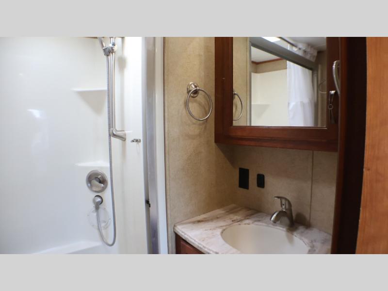 To the right of the entry door you can step up to a side aisle bath with residential shower, toilet, and sink with medicine cabinet.