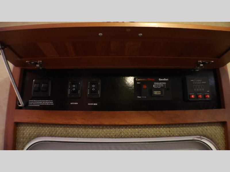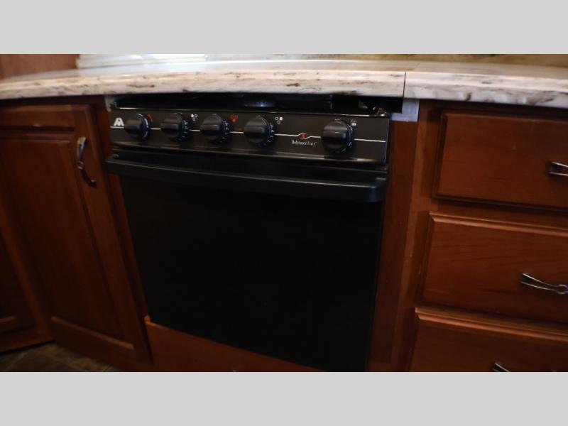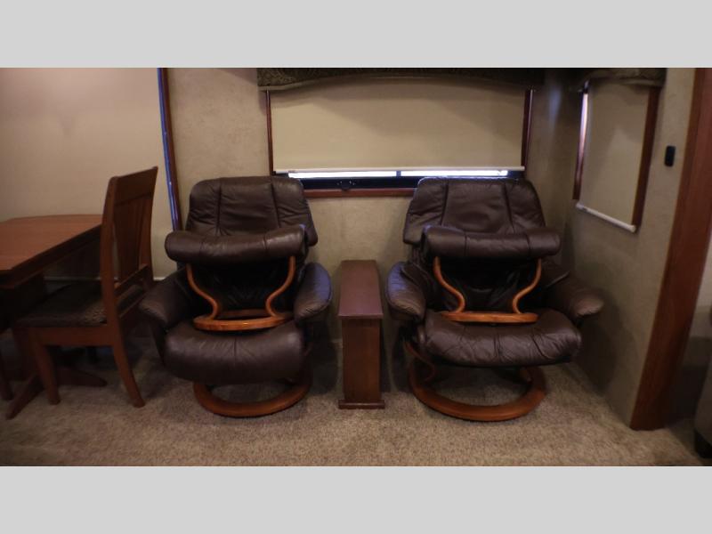 Step inside the entry door and be greeted by a spacious dining area. There are double slides opposite one another with a dinette and two recliners on the entry side. Enjoy a convenient kitchen island in the center of the room with a Corian counter top and double sinks. The slide opposite has everything you need to create family meals, snacks and much more. There is a pantry for storage, refrigerator and 3 burner range with a microwave oven above. There is also plenty of overhead storage cabinets and counter space too. An appliance garage and a pull-out desk with entertainment center completes the large slide.
