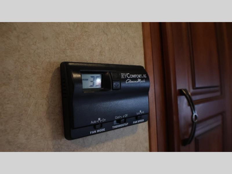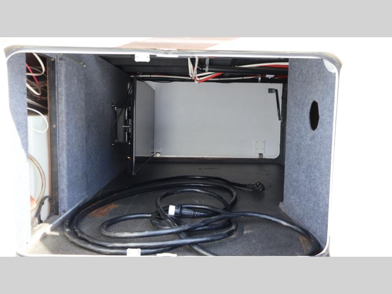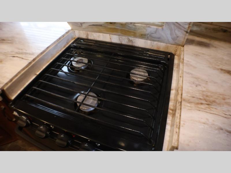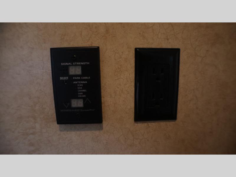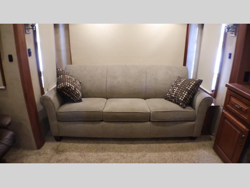 Enjoy hanging out on the rear hide-a-bed sofa including end tables and overhead storage. Or, use it for sleeping when you entertain extra guests.