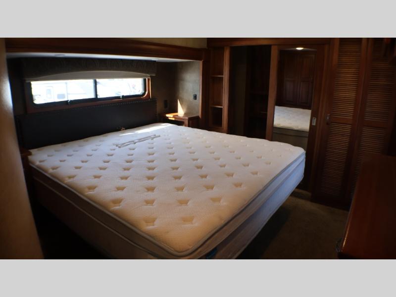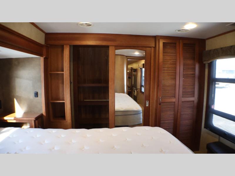Continue on past the bath to a spacious front bedroom with queen bed slide-out including nightstands on both sides of the bed. There is a wardrobe with sliding doors, window seat, and dresser with overhead storage cabinet. There is a second wardrobe or an optional two piece washer and dryer for your convenience.