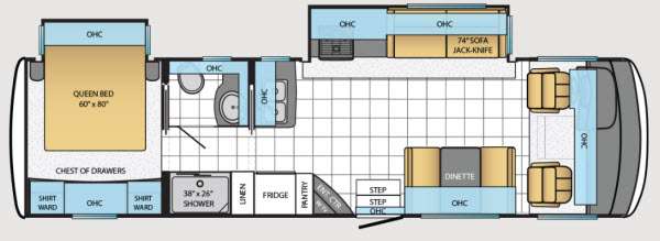 As you enter, you’ll find a welcoming dinette to your right, perfect for meals or relaxing. To the left, a corner entertainment center with a flat-screen TV, along with a pantry, refrigerator, and linen cabinet, provide both entertainment and smart storage.