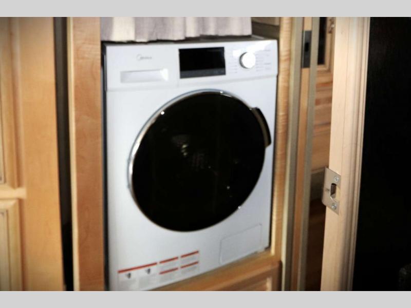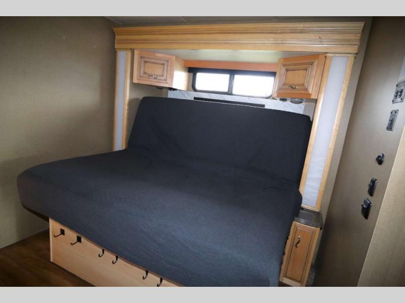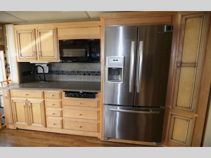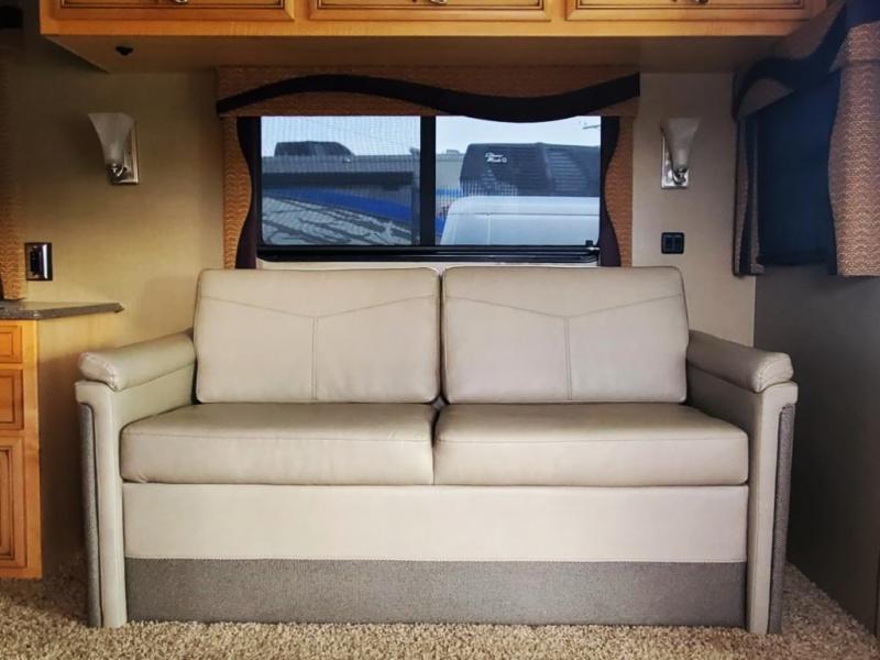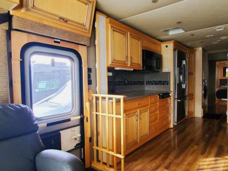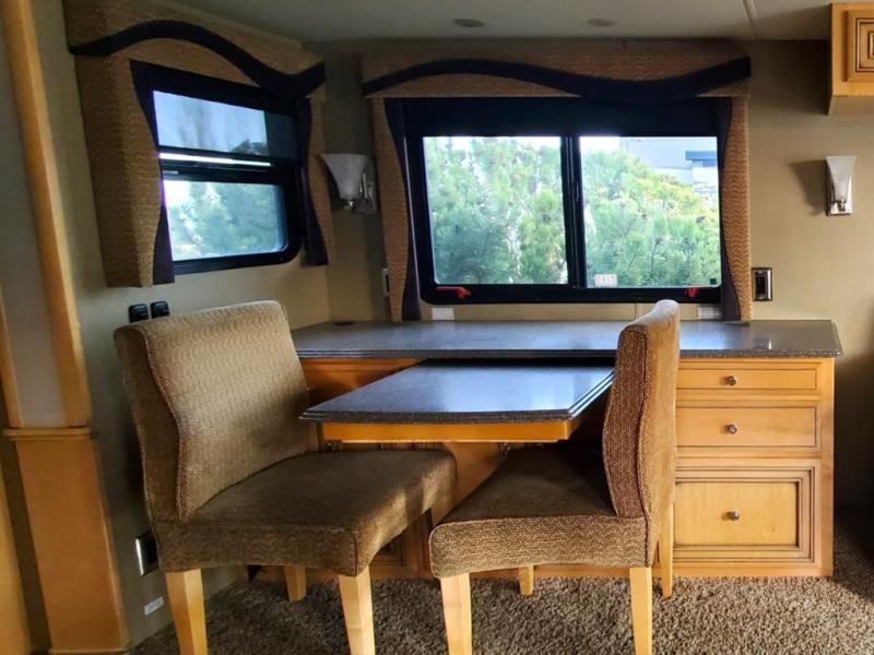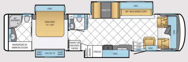 As you enter the motor home, to the right is a recliner. To the left of the entrance is a slide with a double kitchen sink, three burner range, refrigerator, and two pantries. Next to the slide is a large wardrobe for added storage. The opposite side has a slide with a sofa, and dinette. Next to the dinette there is a dry bar with TV. Around the corner from the dry bar is a convenient half bath.