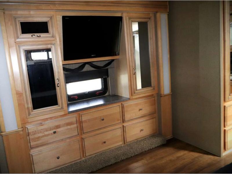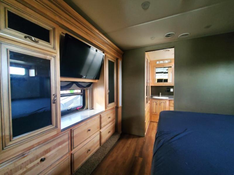 The bedroom offers two slides, one slide has the king bed, the other slide offers two shirt wardrobes and an overhead TV.