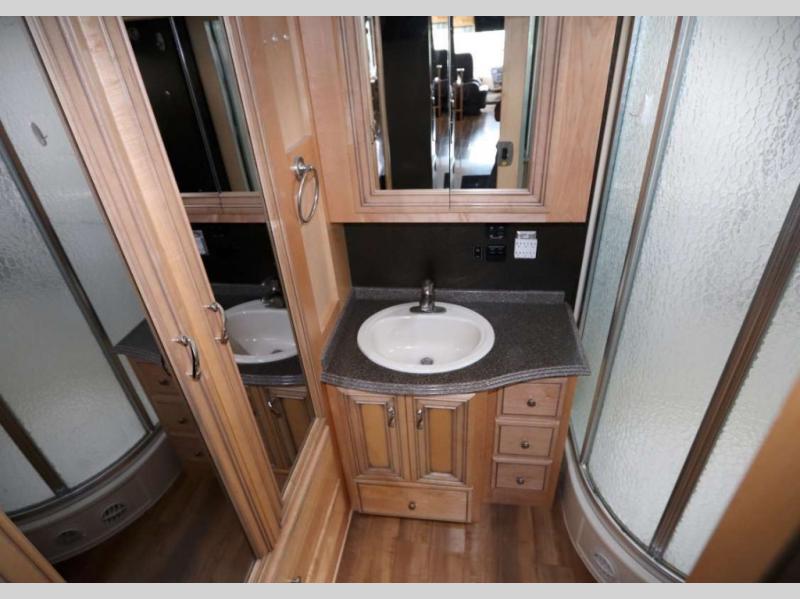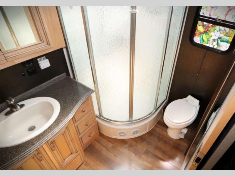 The master bath is located in the very rear of the motor home. The bathroom offers a toilet, corner shower, sink, and wardrobe with mirror doors.