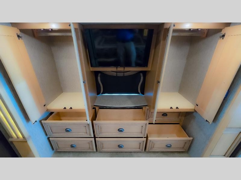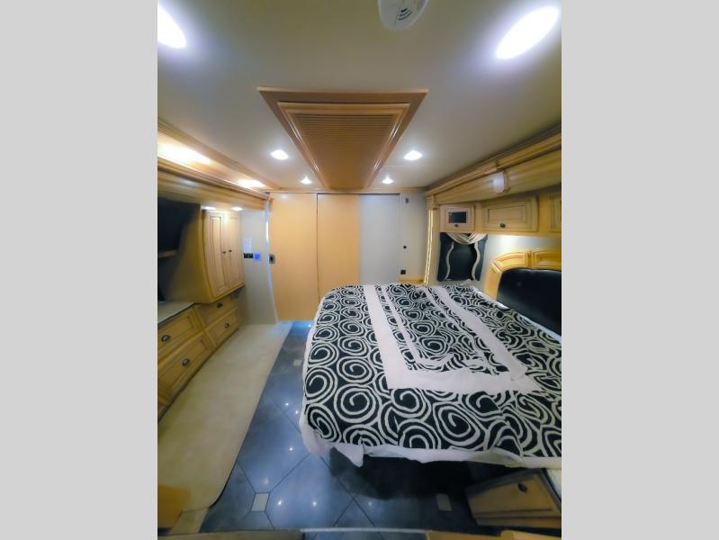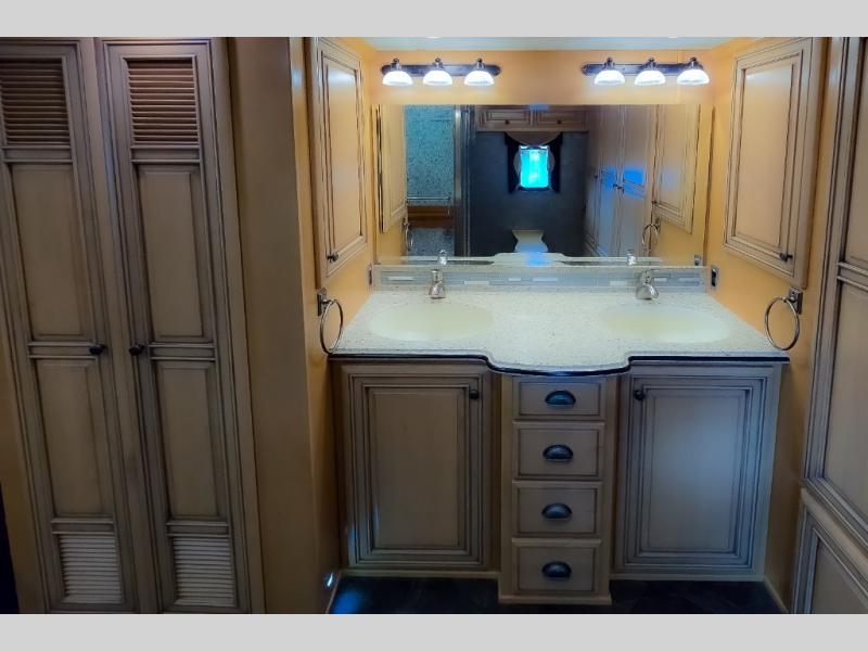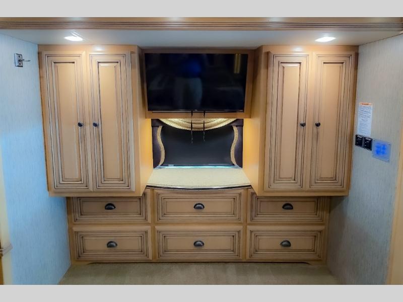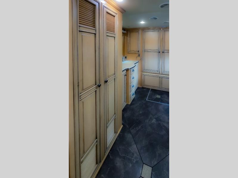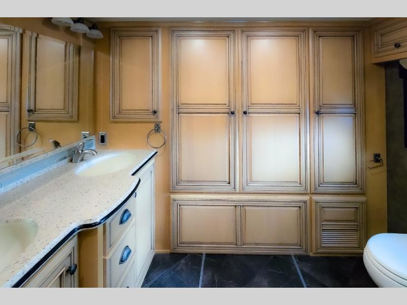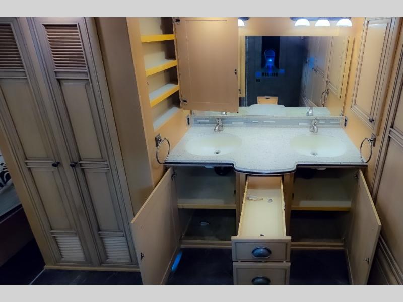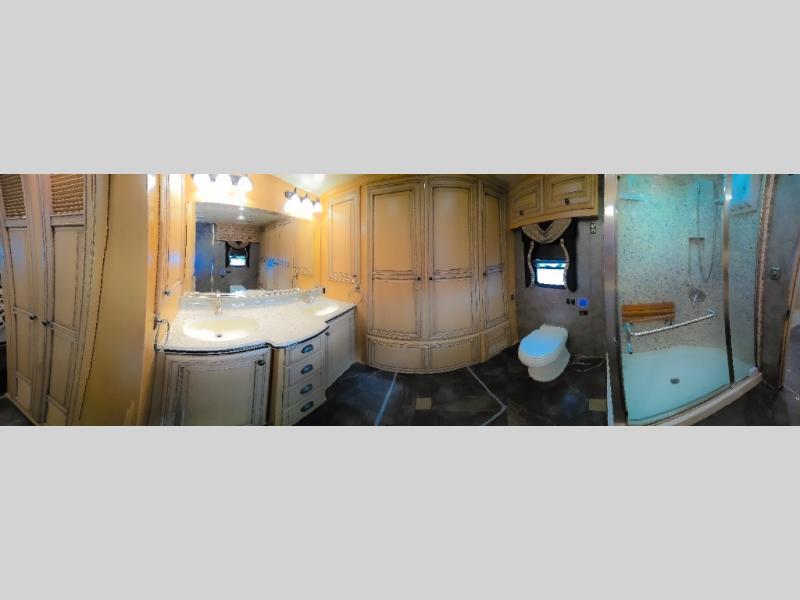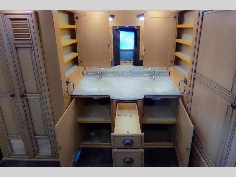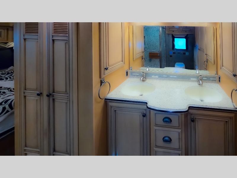 The bedroom offers a king bed slide. In the rear of the motor home, you will find the master bath. The bath has a wardrobe, two sinks, wardrobe, toilet, and shower. The full wall slide has two wardrobes, a chest of drawers, overhead TV, pantry, refrigerator, hide-a-leaf dinette, and hide-a-bed sofa.