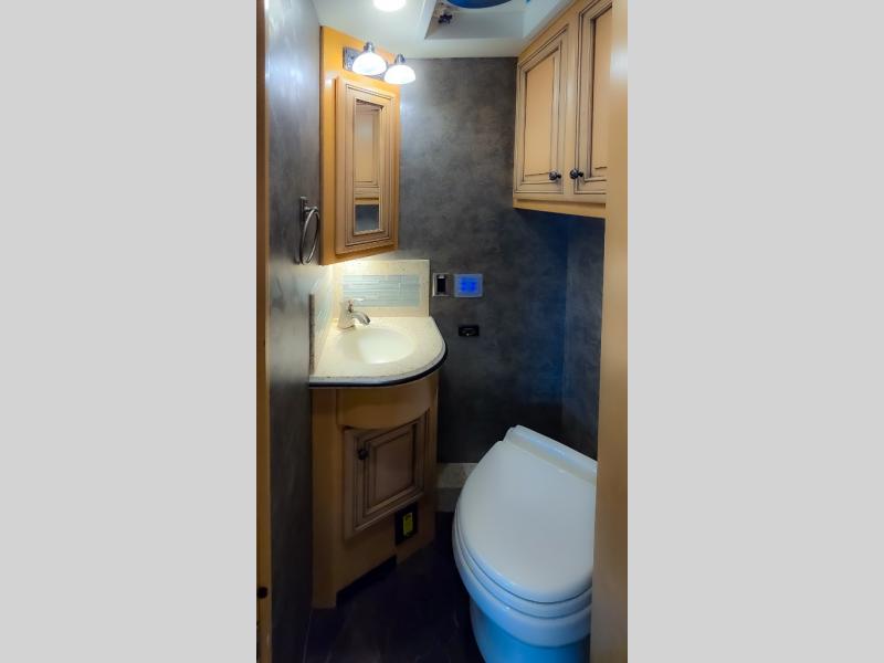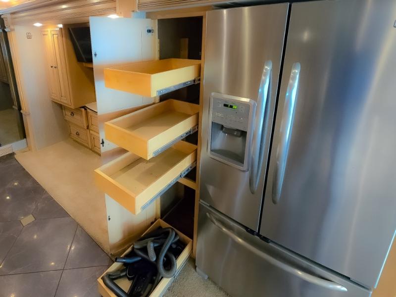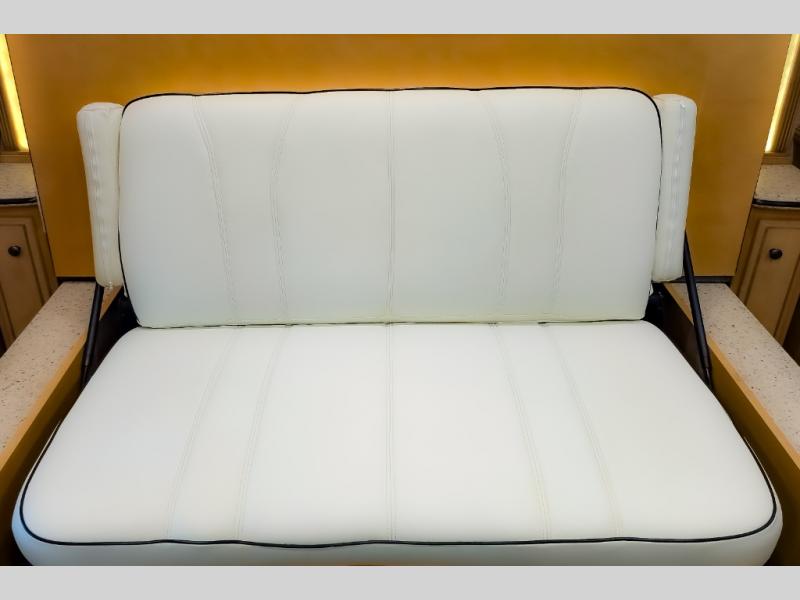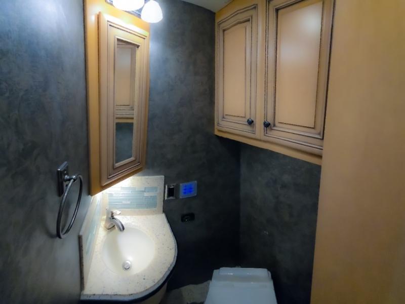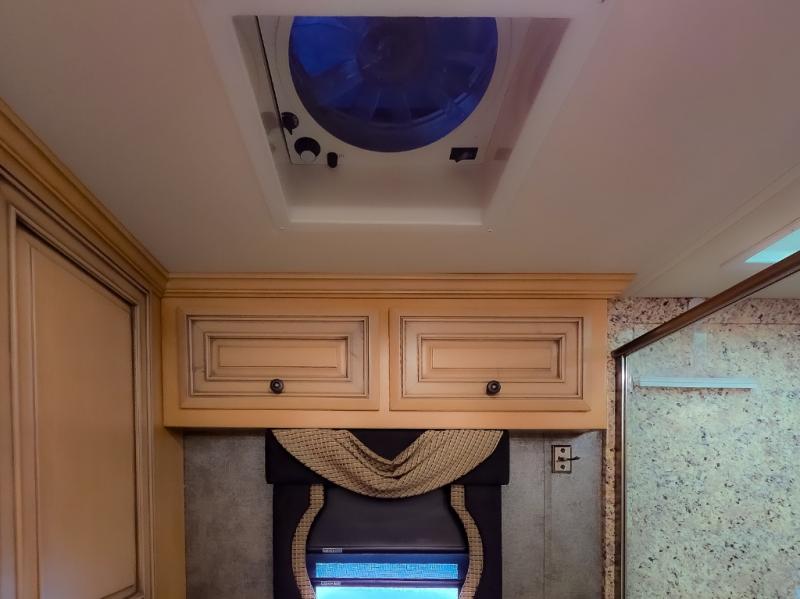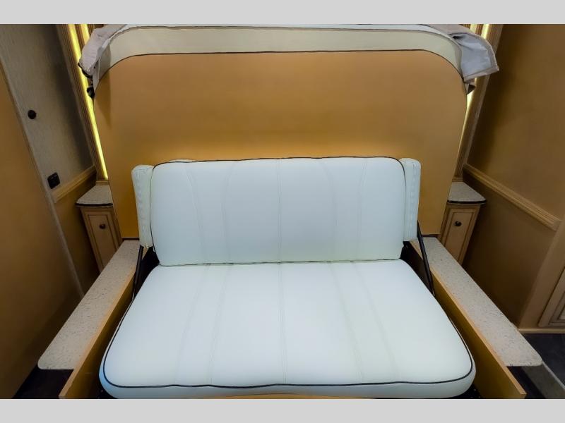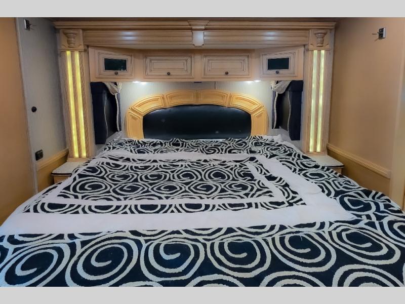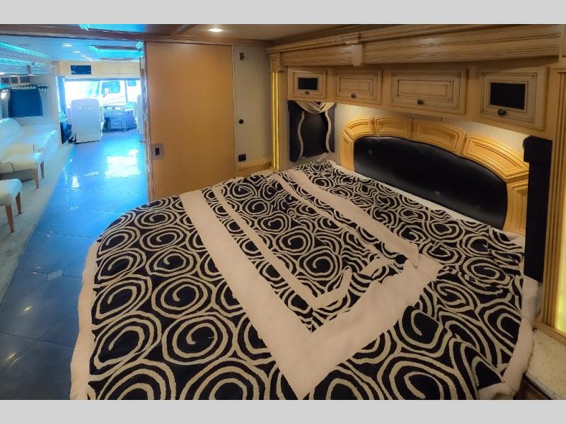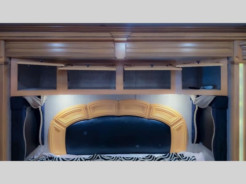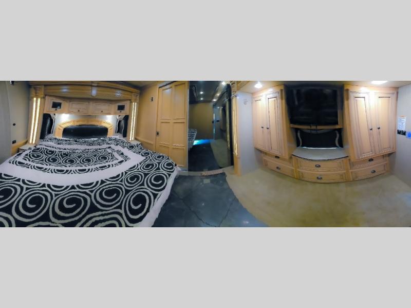 The bedroom offers a king bed slide. In the rear of the motor home, you will find the master bath. The bath has a wardrobe, two sinks, wardrobe, toilet, and shower. The full wall slide has two wardrobes, a chest of drawers, overhead TV, pantry, refrigerator, hide-a-leaf dinette, and hide-a-bed sofa.