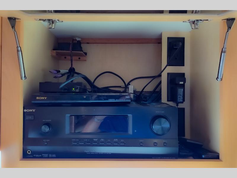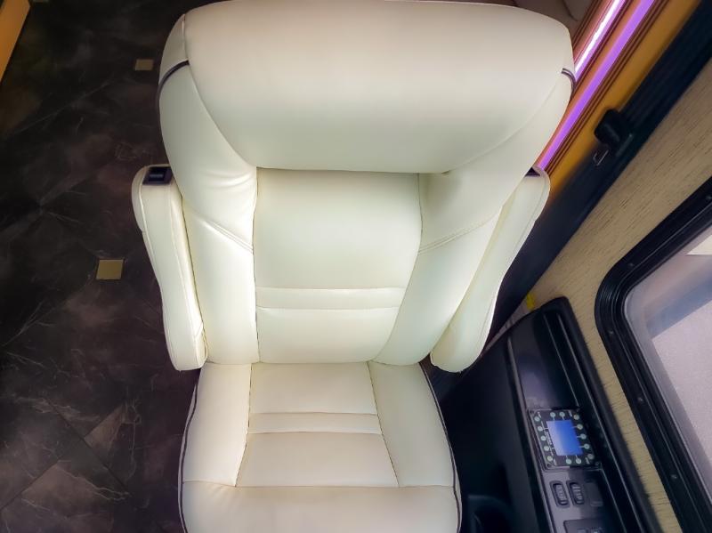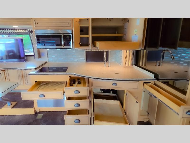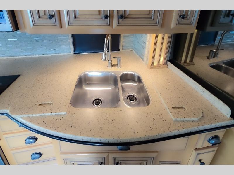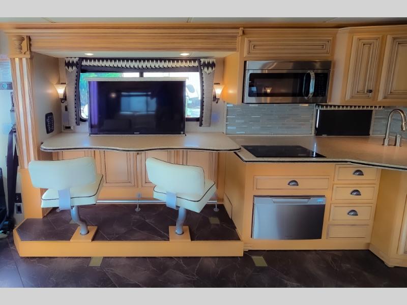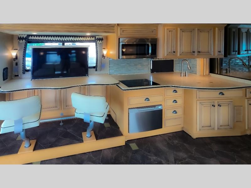 As you enter the motor home, to the left there is a slide with LED TV, bar, three burner range, and double kitchen sink.