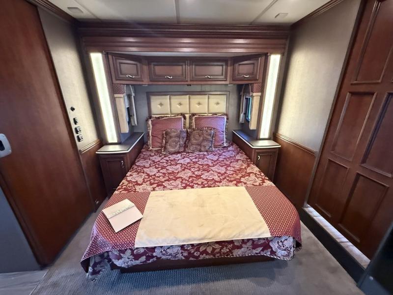 The half bath is down the hall. The rear bedroom has a king bed slide. The master bath offers a toilet, sink, wardrobe, and corner shower. There is a full wall slide with two wardrobes, a chest of drawers, overhead TV, pantry, refrigerator, booth dinette, and hide-a-bed sofa.