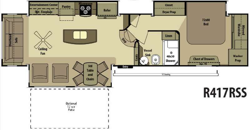 Model 417RSS features a rear living area with sofa and overhead storage the entire width of the unit. There is a slide-out set of swivel rockers and a dining room table with chairs on one side and a slide-out entertainment center with optional fireplace, pantry, three burner range with microwave oven, and refrigerator on the other side. In the center of the room you will enjoy a convenient kitchen island with double sink, more counter space, and additional storage.
