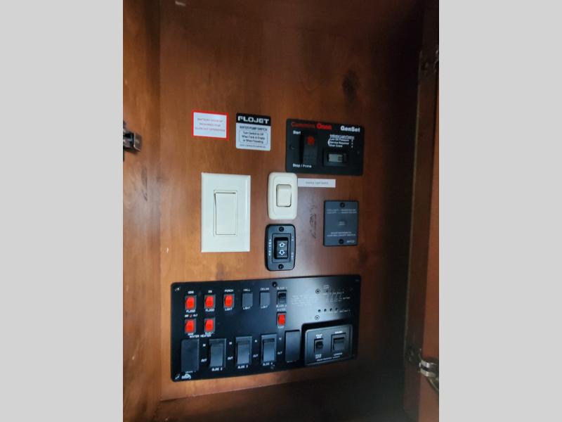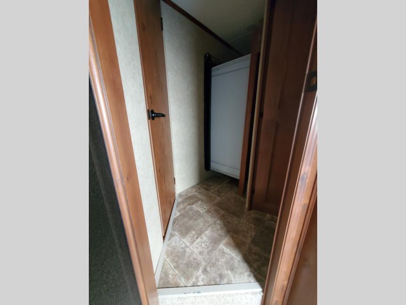 Move into the front bedroom and see a large slide-out king size bed with closet area which includes dryer prep. There is a chest of drawers opposite the bed and a front wardrobe with sliding doors for hanging clothes. There is another closet in the front corner that has been prepped for a washer. You can also add a TV above the dresser.