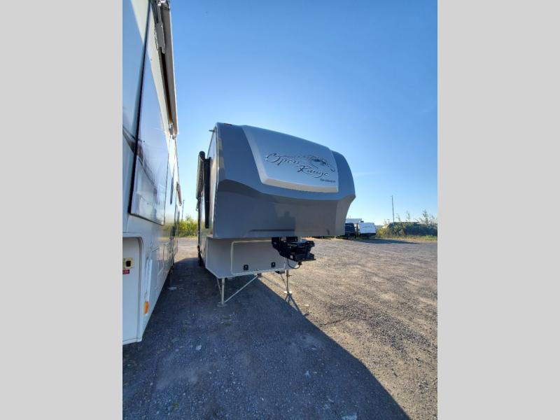 This Residential fifth wheel by Open Range RV is a welcome retreat as you step inside. Notice the spaciousness in the combined living and kitchen space with large dual opposing slides.