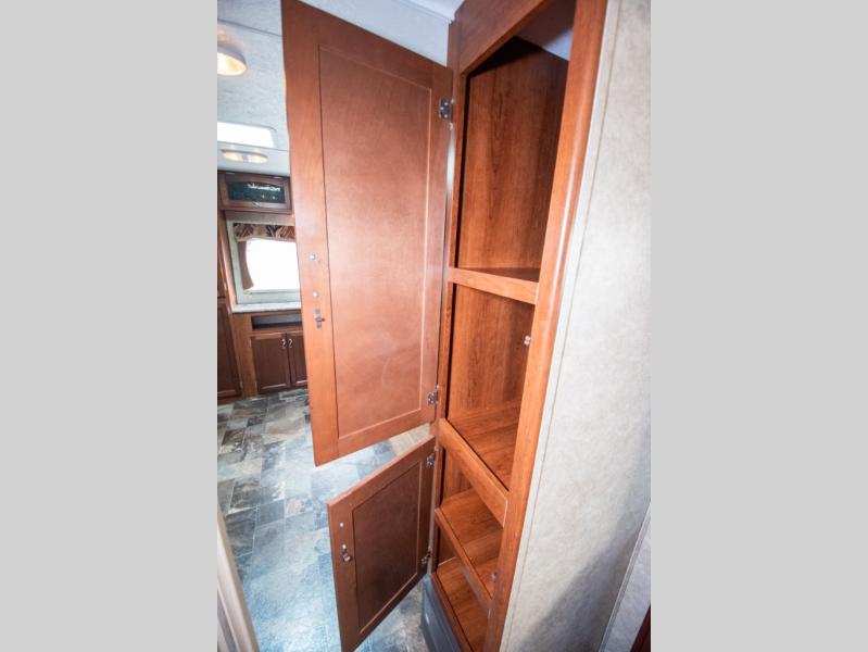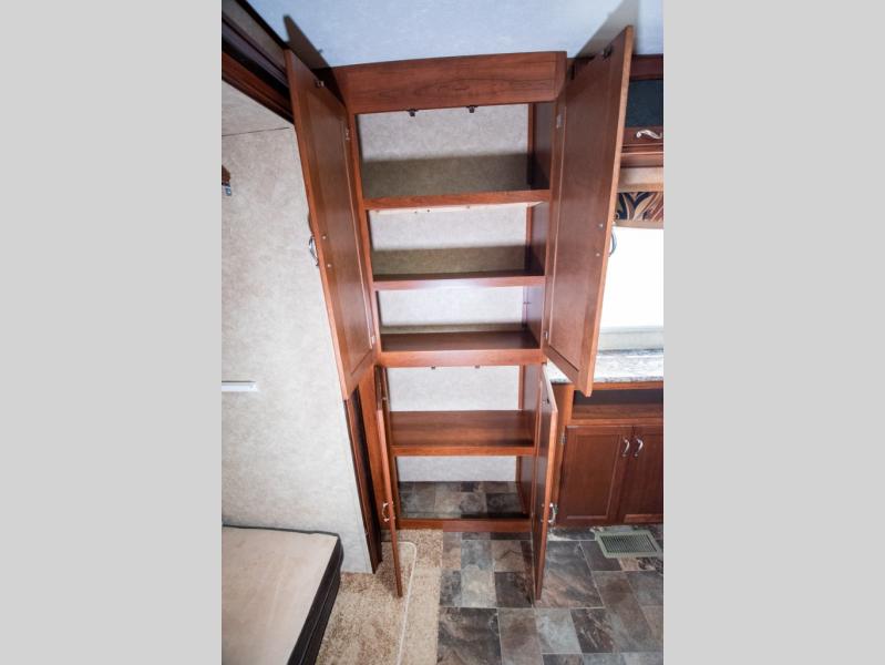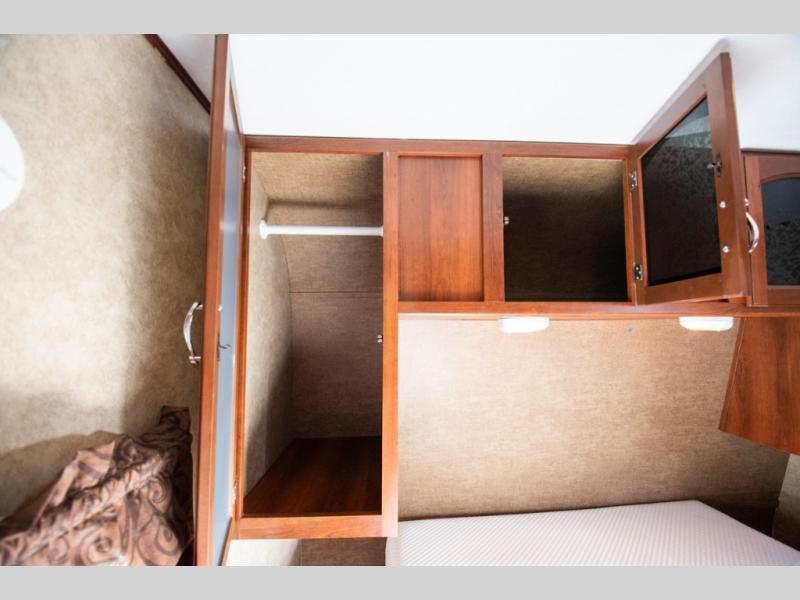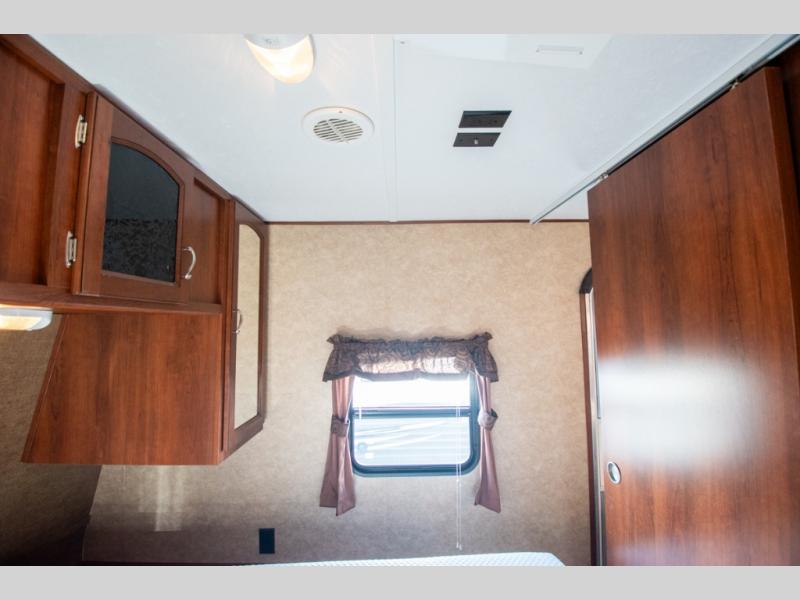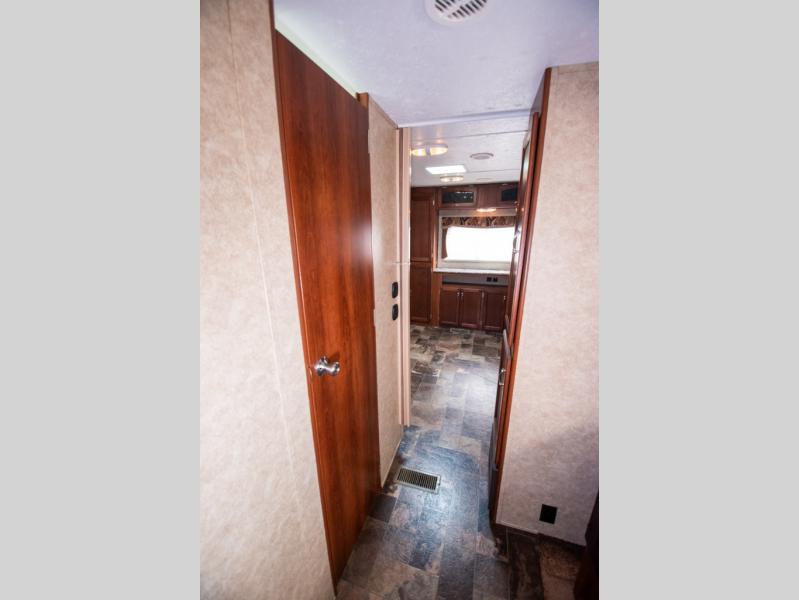 Upon entering the travel trailer, to the right is the bedroom with a queen bed and closets on either side of the bed.