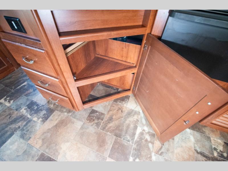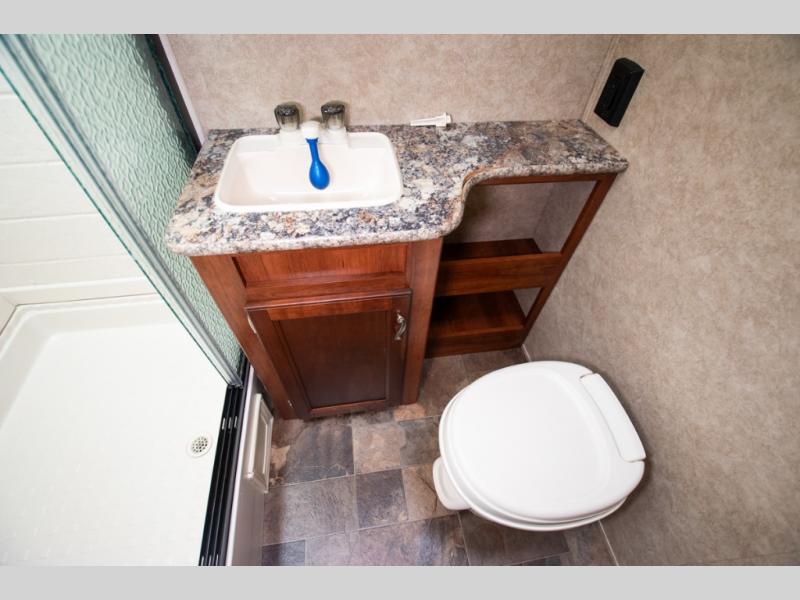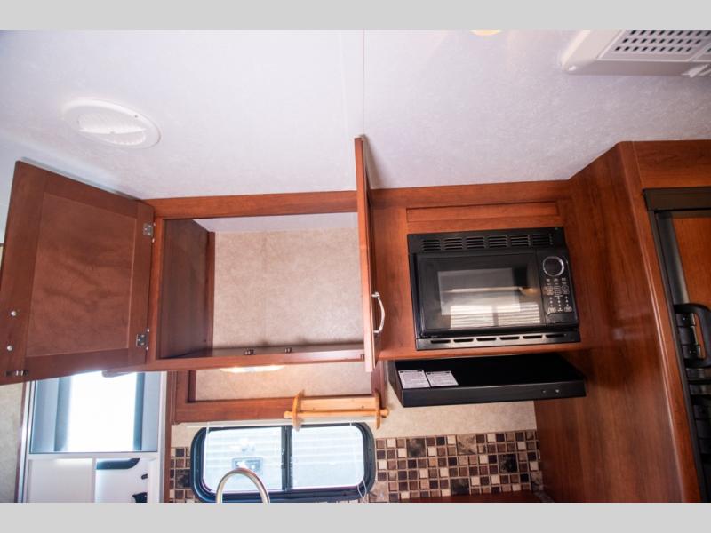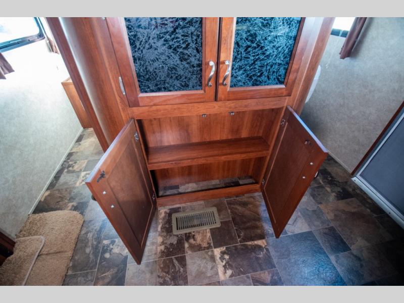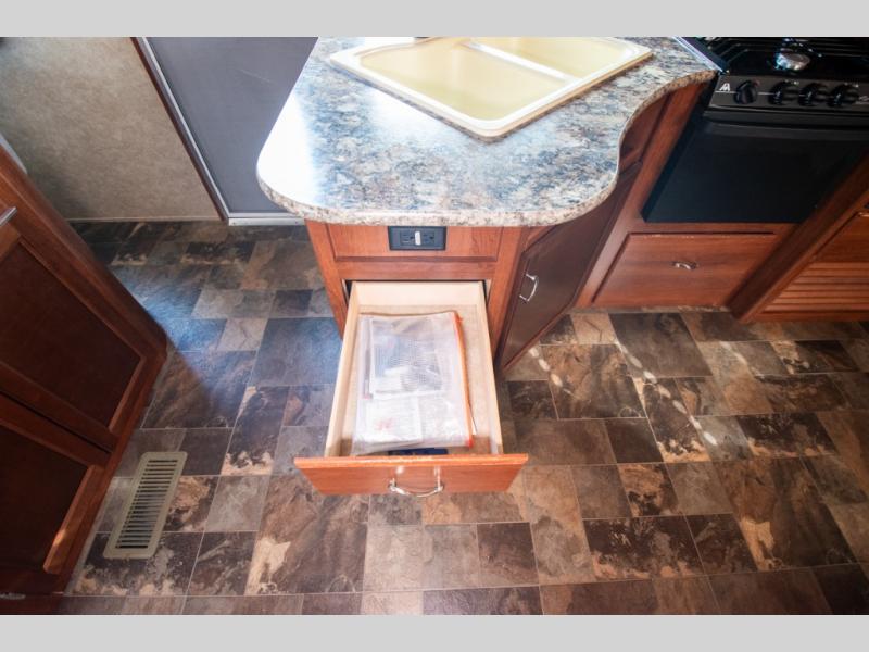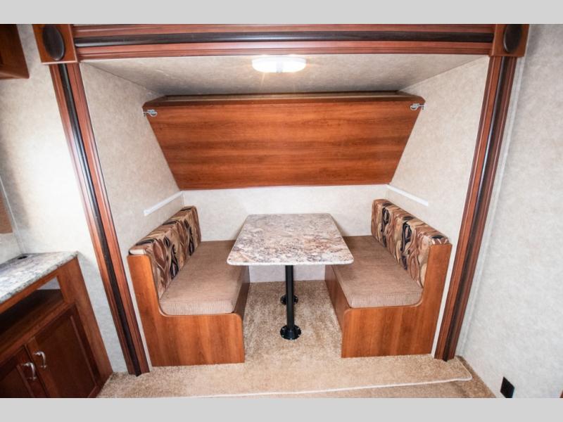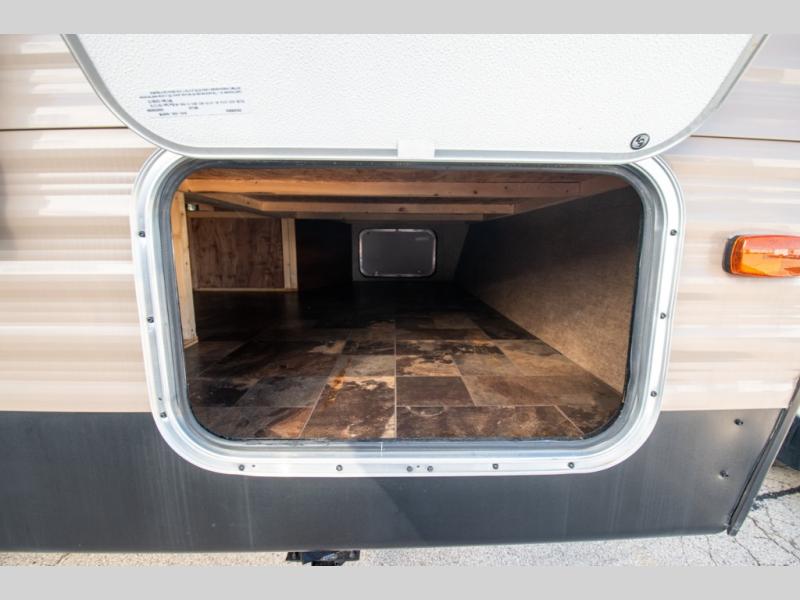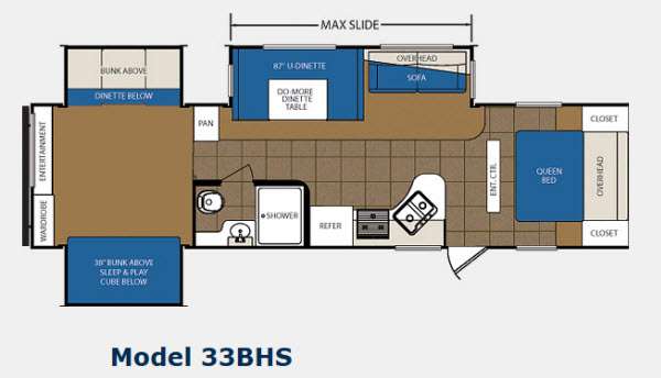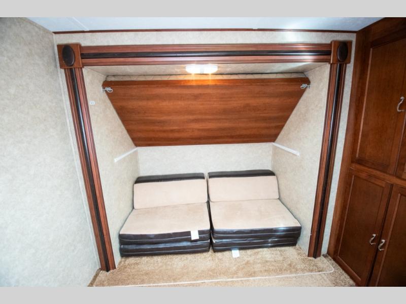 In the rear of the travel trailer there is a nice size bunk house that your kids will surely enjoy. You will find two slides. One slide has a dinette with a bunk above. The other slide offers a sleep & play cube with a bunk above. Along the rear wall you will find an entertainment center and a wardrobe.