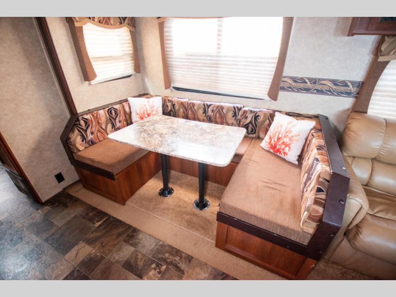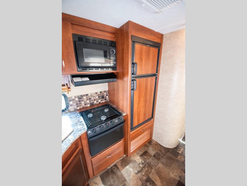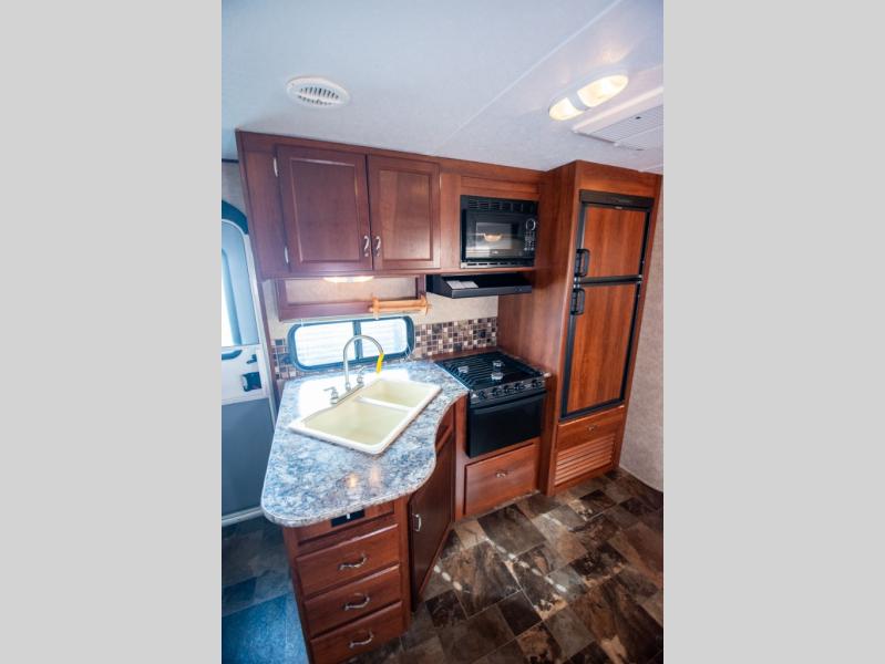 The kitchen and living areas offer a slide with a sofa and u-dinette table. Next to the dinette is a pantry. The opposite side of the travel trailer has a double kitchen sink, three burner range, and refrigerator. In the front of the living area you will find a nice entertainment center.