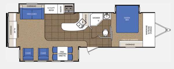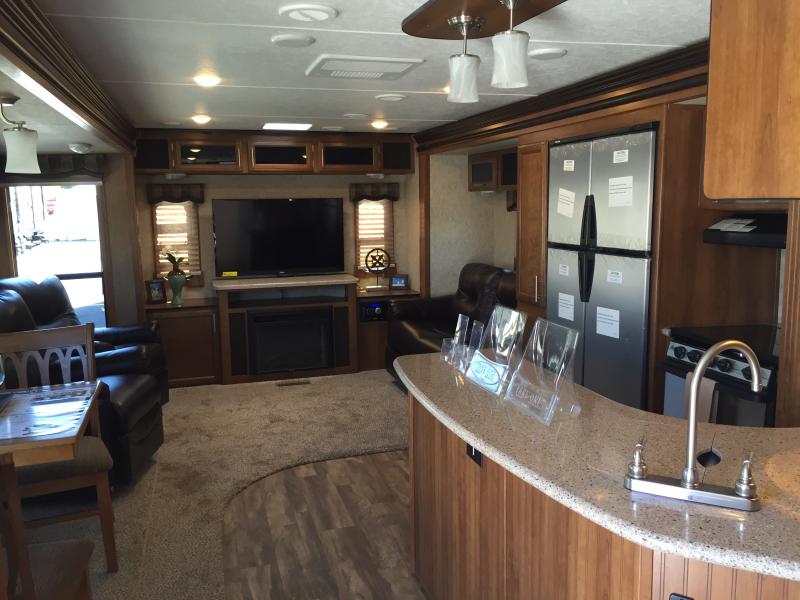 What I liked most: Long kitchen peninsula makes for nice kitchen counter space. Normal kitchen table with four chairs lots of windows on the dining in the living area side. Nice seating placement with two recliners across from a love-seat with the rear entertainment TV and fireplace in the rear. Large double door refrigerator with average storage and kitchen area. Master bedroom feels adequate when you walk in. Headboard is a nice touch behind a super big bed. Large sliding wardrobe with full length mirror. Ceiling vent in master bedroom adds extra light.