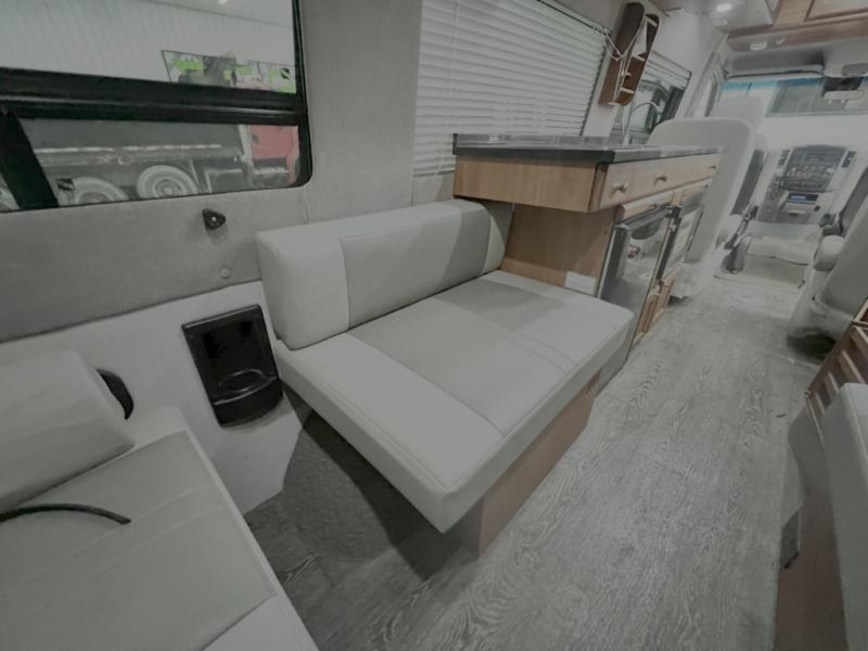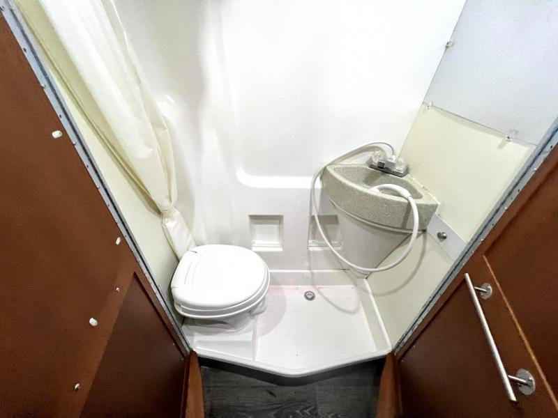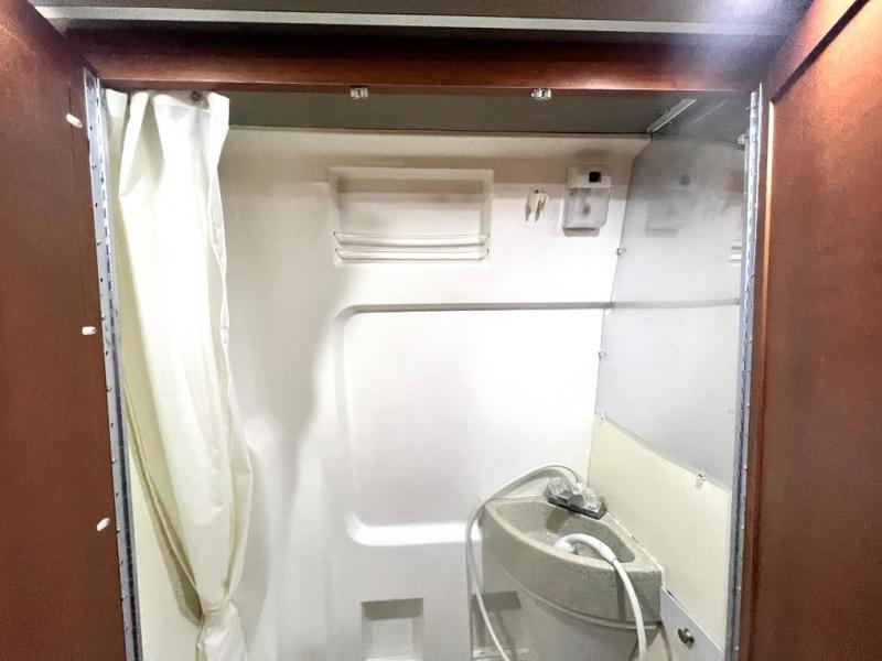 Continuing on the passengers side, there is an enclosed toilet, shower, and sink area. A wardrobe is near the back. The rear of the van can hold either a power sofa dinette with two additional bench seats or a u-shaped booth dinette. Both dinettes will convert to a king size bed or two twins.