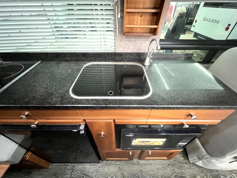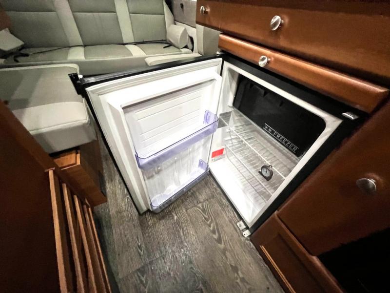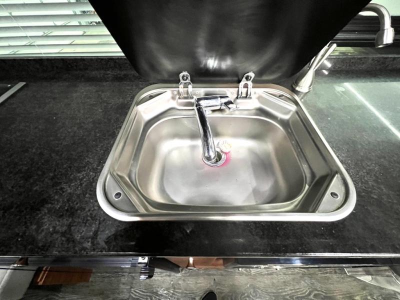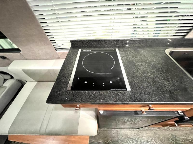 Along the opposite side of the E-Trek, you will find a burner induction stove top, a refrigerator, single sink bowl and microwave.