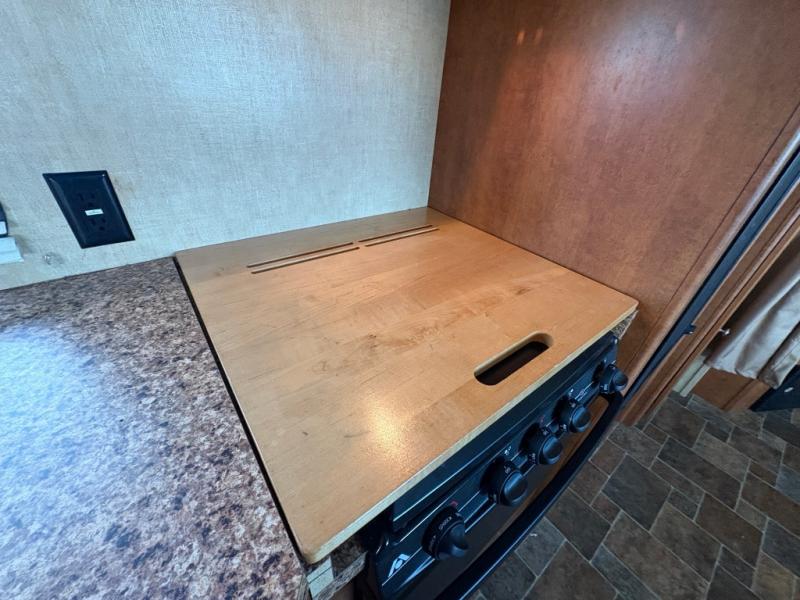 Continuing around, a generous slide out provides a sofa, overhead cabinets and a u-shaped dinette booth. You may choose the optional free standing table and chairs.