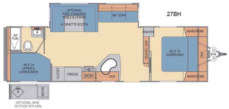 One rear corner includes a bathroom with a 40" tub, a toilet and a vanity sink with a medicine cabinet. The opposite corner includes 48"x74" upper and lower bunk beds.