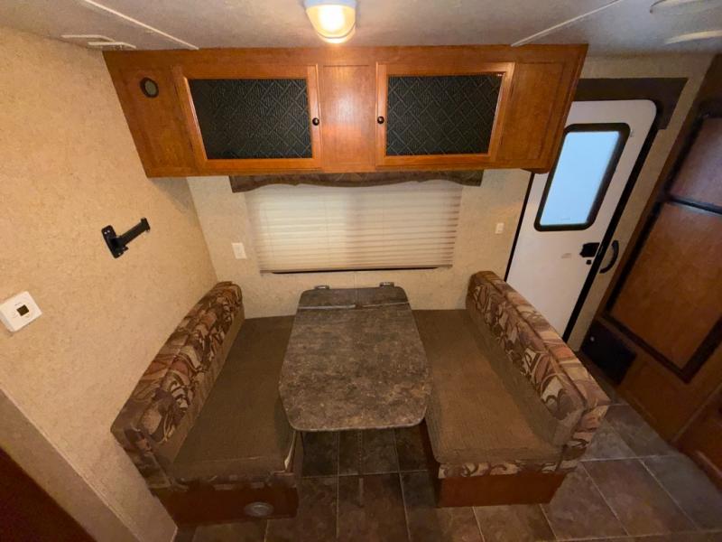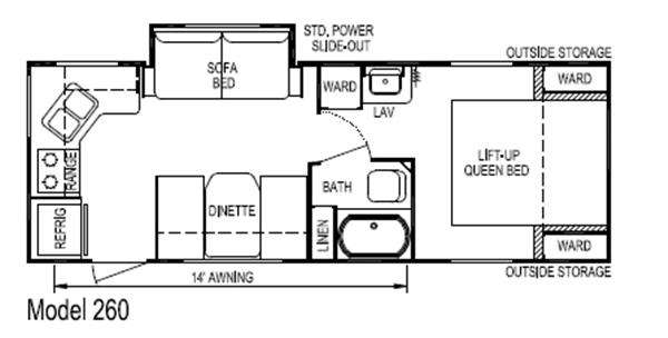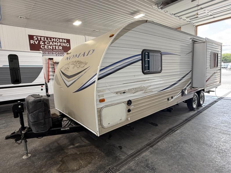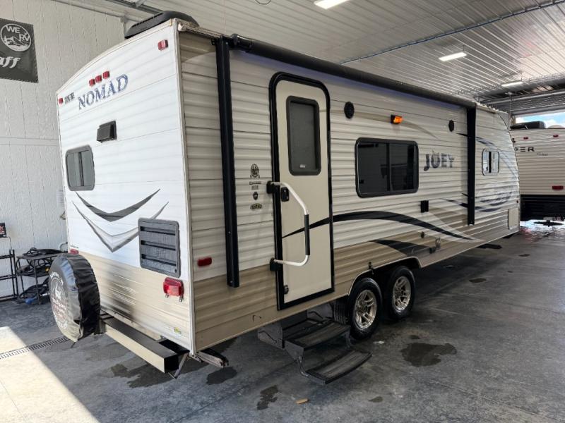 Single Slide Nomad Joey Select Travel Trailer, Rear Kitchen w/Refrigerator, 2-Burner Range, Double Kitchen Sink, Sofa Slideout, Booth Dinette, Toilet, Linen, Shower, Wardrobe, Lav., Front Queen Lift-Up Bed, Double Wardrobes, Overhead Cabinets Throughout, 14' Awning & Much More.