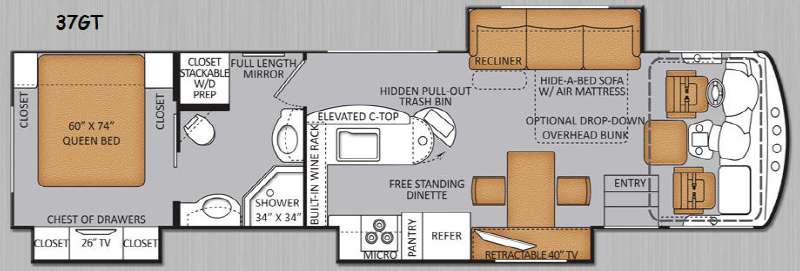 Heading toward the rear of this Challenger 37GT you will walk-thru a complete bath with angled shower, toilet, sink with overhead cabinet, full length mirror, and closet with stackable washer and dryer prep.