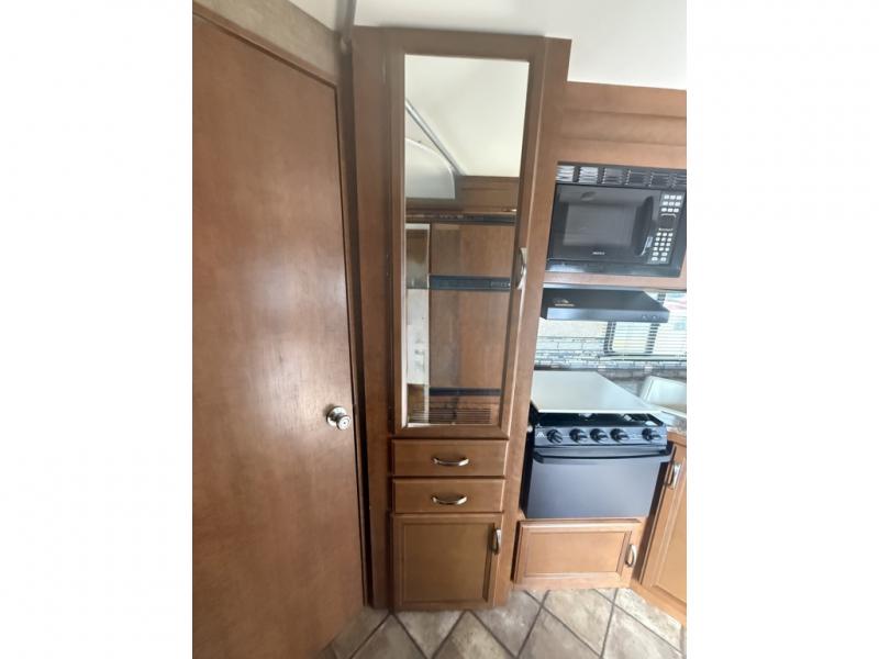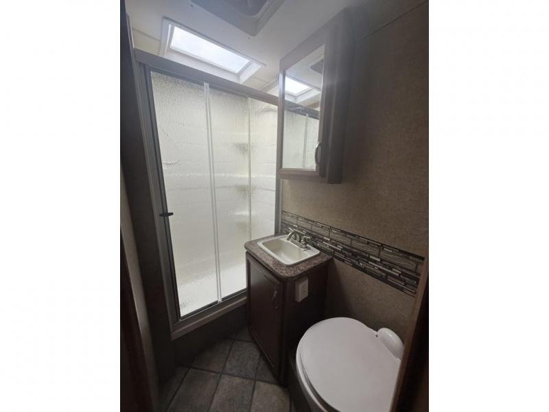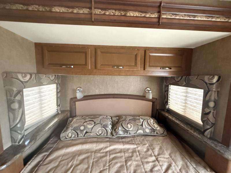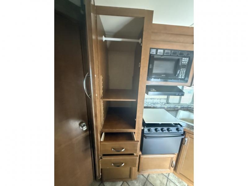 In the rear find a queen bed slide with nightstands and overhead cabinets providing a comfy place to rest and relax. There is a corner bath featuring a tub/shower, toilet, and vanity with sink, plus overhead medicine cabinet. A handy closet can be found just outside the bathroom door for clothing storage and more.