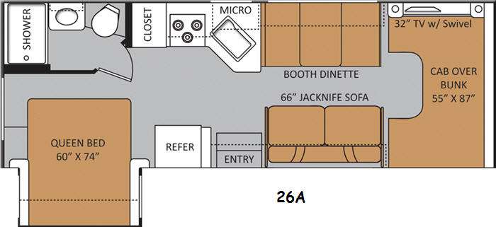 Step inside and find a 66" jackknife sofa to the right of the entry door. Across from the sofa is a booth dinette. Both sofa and dinette offer overhead storage and can each be made into additional sleeping space for the kids or extra guests.