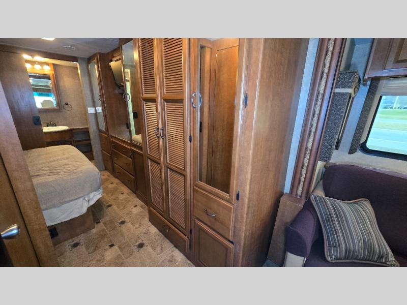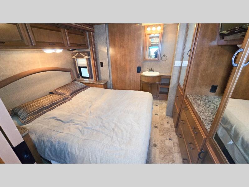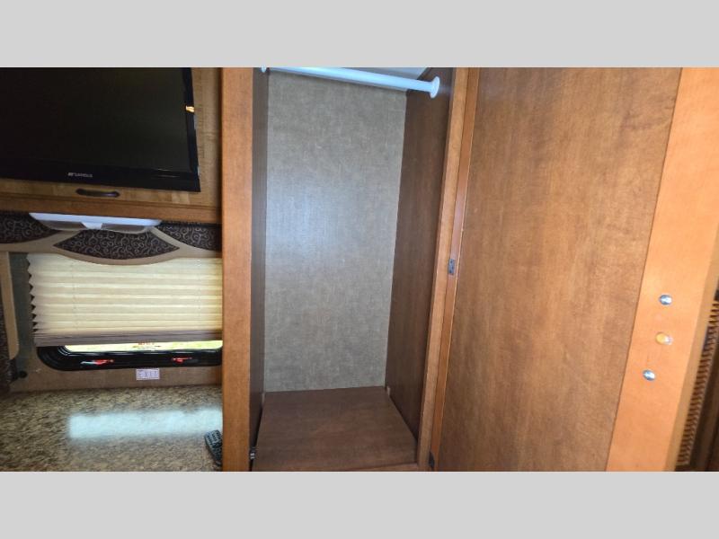The bedroom offers a queen bed slide out including nightstands at each side and overhead cabinets. The wall opposite the bed provides two closets and a 19" LCD TV.