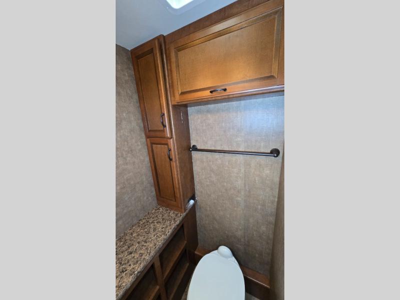 The rear of this motor home holds a full bathroom with shower, large vanity with sink, medicine cabinet, linen storage, overhead cabinets and toilet.