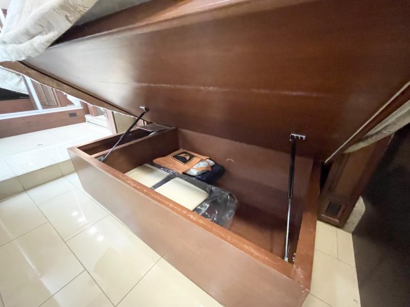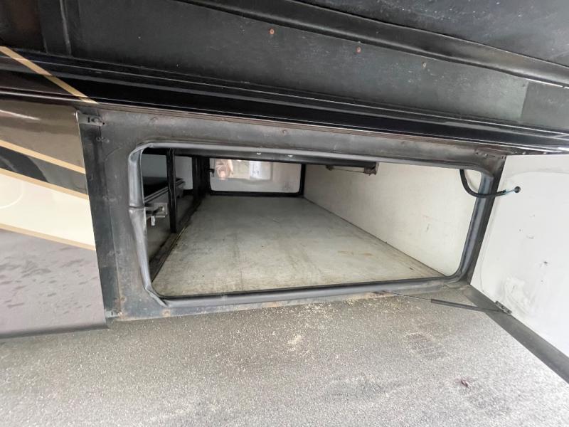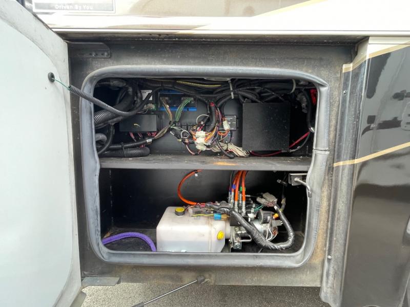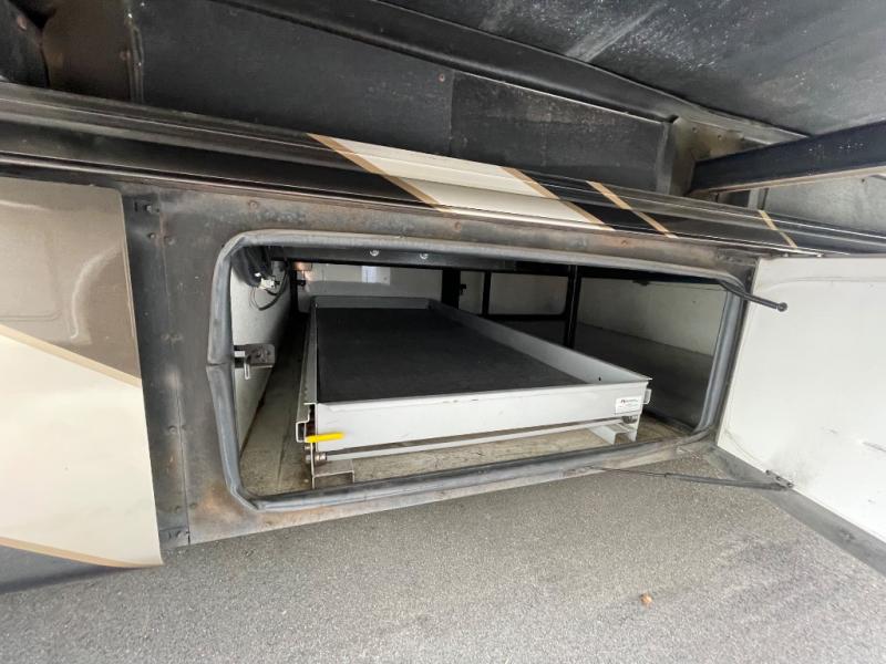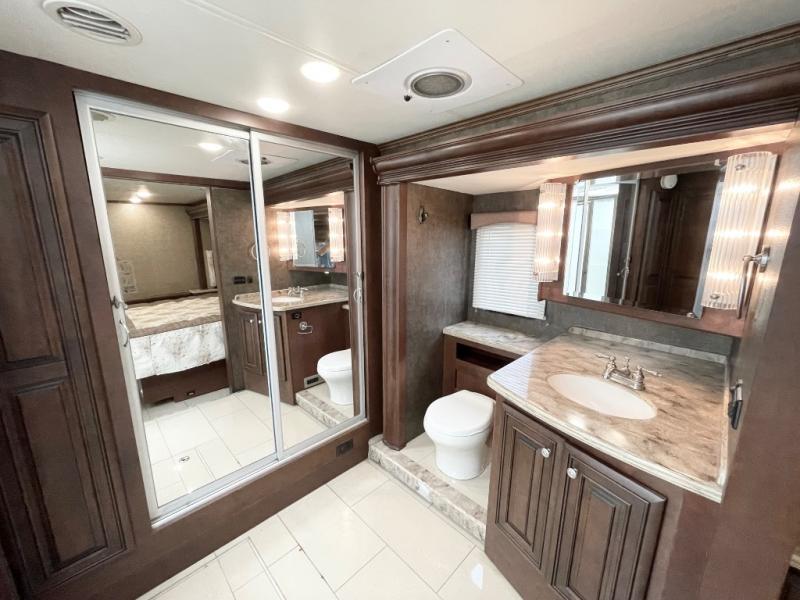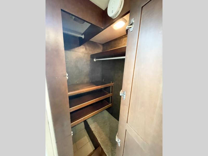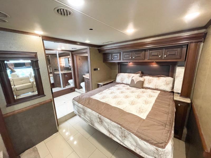 A sliding door leads into the rear bedroom and master bath. In the bedroom you will find a king size bed with nightstands, and a toilet and sink slide-out on your right. The left side finishes up the full wall slide with a chest of drawers and 32" HDTV for your enjoyment.