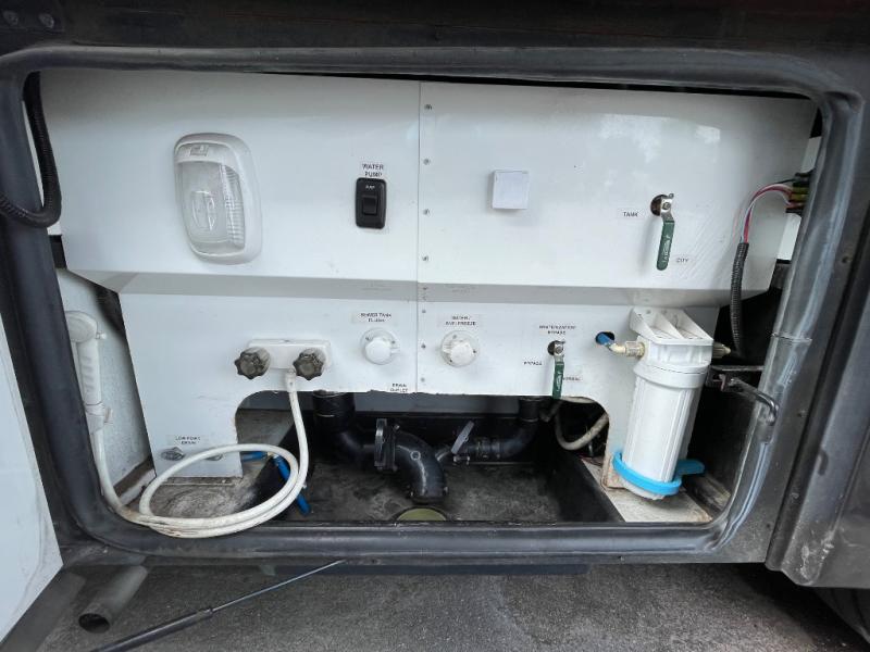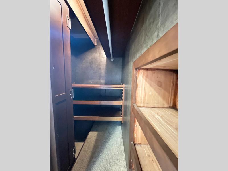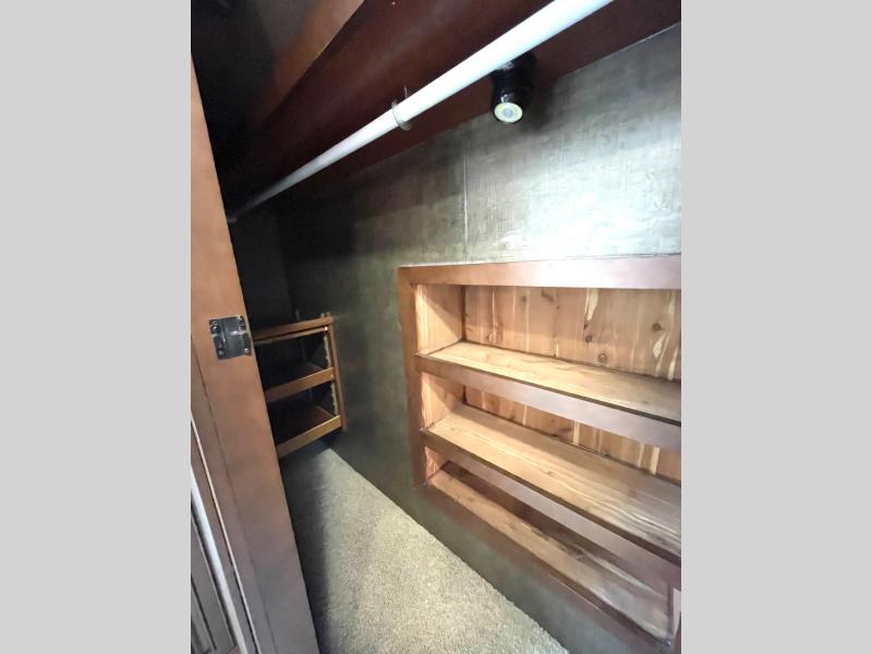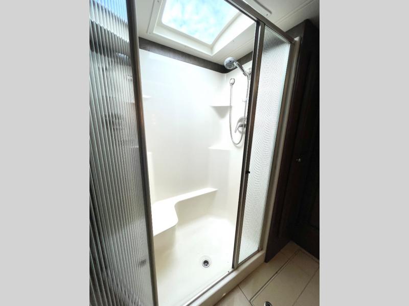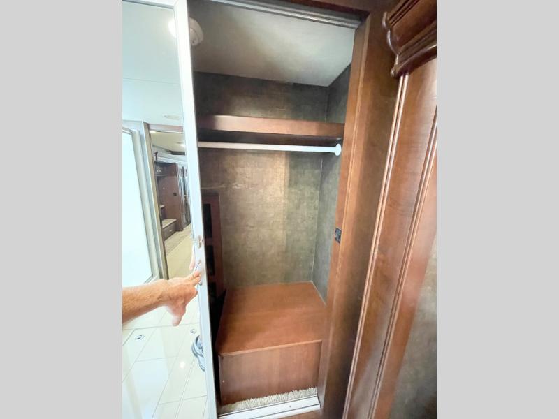 In the rear bath you will find a 42" x 30" shower, wardrobe, linen cabinet, and the toilet and sink that is attached to the king bed slide plus more.