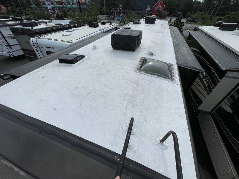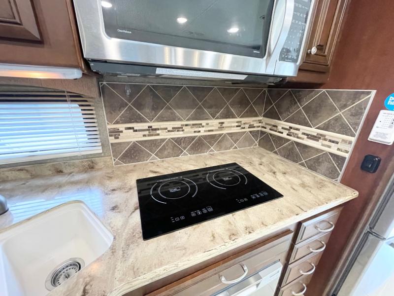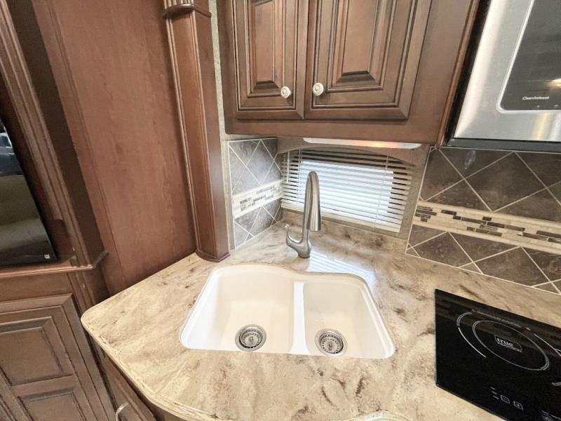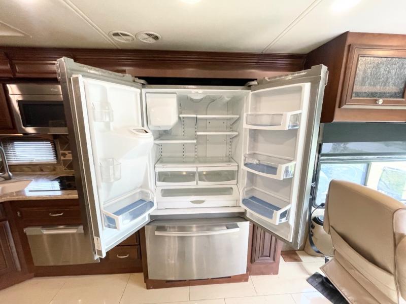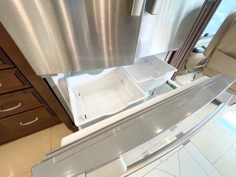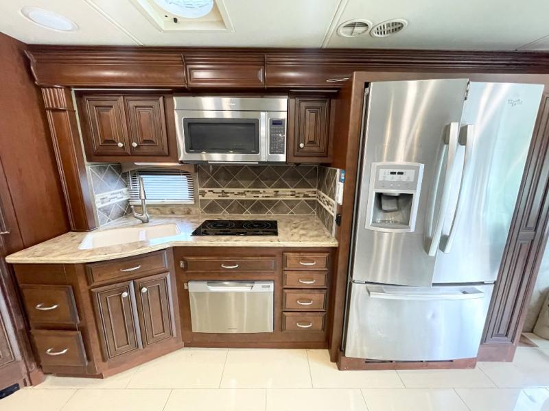 Enter model 40RX and find a spacious combined living area and kitchen starting right behind the driver and passenger seats. On the road side there is a slide-out pantry, French door residential refrigerator, two burner cook-top with microwave oven above, and a double kitchen sink, plus overhead storage cabinets too.