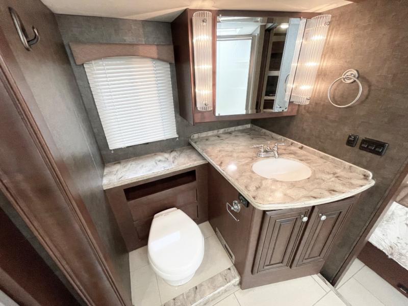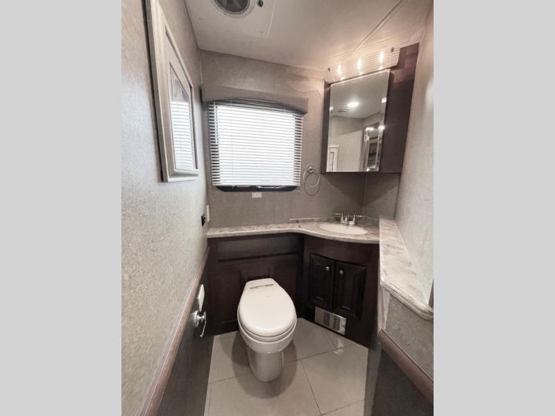 A half bath is centrally located in the coach which includes a toilet and sink. Along the angled bath wall you will find a 46" HDTV for enjoyment.