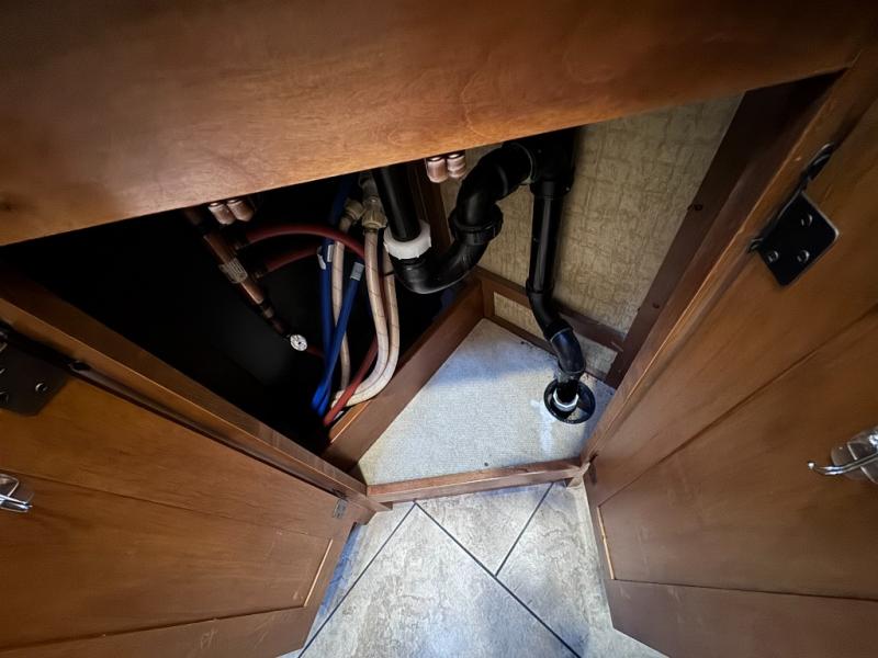 The rear bathroom provides lots of overhead cabinets, a shower, an optional tub, a toilet, a large corner vanity and sink as well as the option for under counter combo washer/dryer.