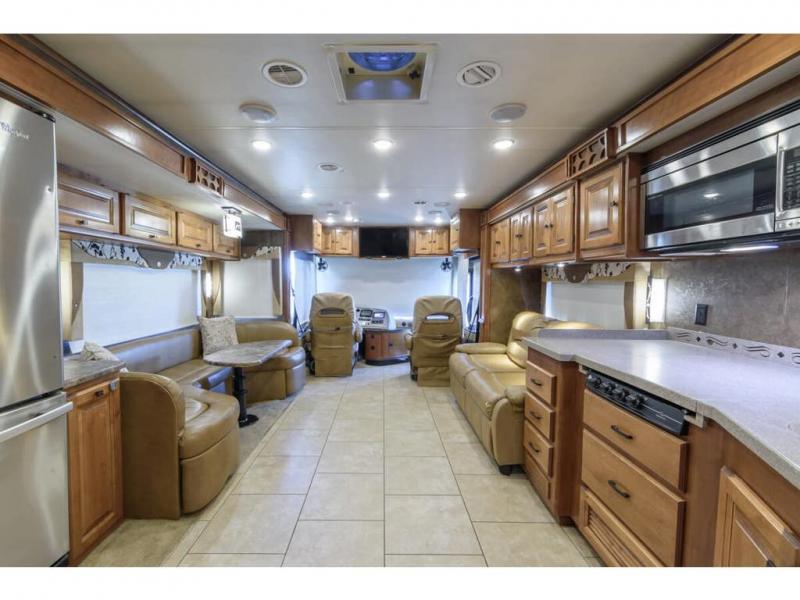 The road side provides a slide out with a generous u-shaped dinette, overhead cabinets, a partial pantry, a 2-door refrigerator and another full pantry. You may choose to have the slide include a lounge chair, dinette with computer workstation, overhead cabinets, refrigerator and pantry. You may also choose an optional 4-door residential refrigerator with 4 batteries. A standard TV faces the front of the coach and is on an interior wall.