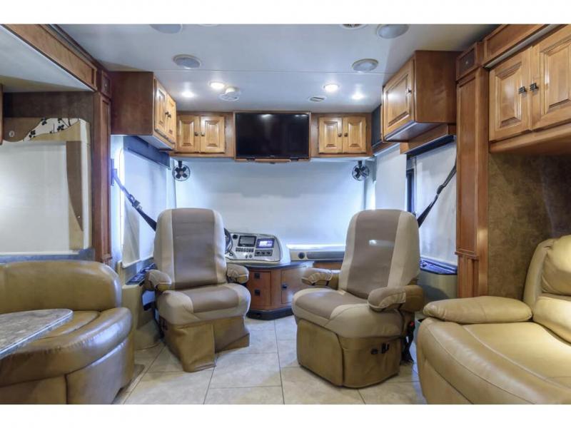 The front cab area holds two rotatable captain's chairs, overhead cabinets all around and an optional center TV.