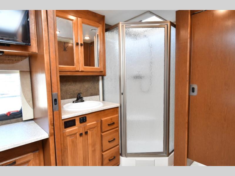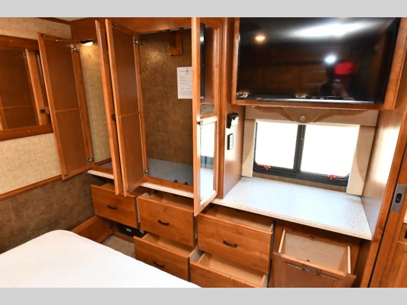 The 2014 Tiffin Allegro 34 TGA delivers the space, quality, and craftsmanship Tiffin Motorhomes are known for, all in a well-designed triple-slide Class A layout. The rear master bedroom features a queen bed slide with nightstands, overhead storage, a wardrobe with drawers, and a vanity with TV across from the bed, creating a comfortable private retreat. A split bathroom design adds convenience with a corner shower and sink on one side and a private toilet and second vanity across the hall.