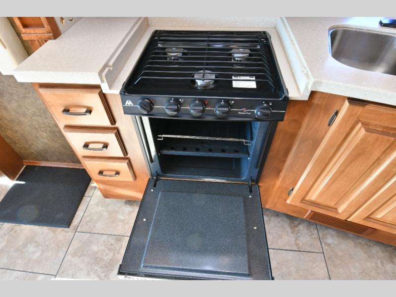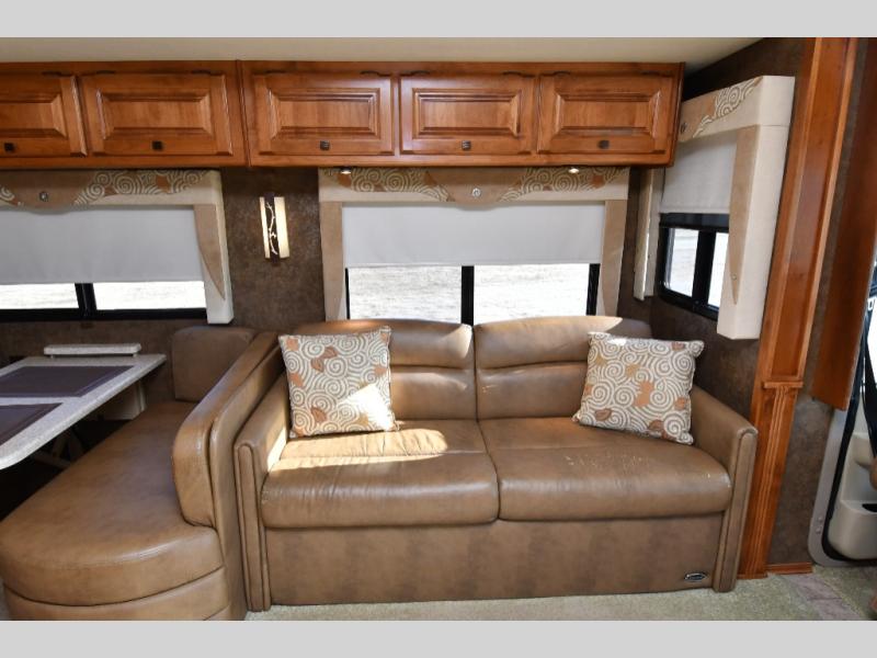 The living area opens up with a large driver-side slide that houses a sofa bed and booth dinette, creating plenty of room to relax or entertain. A standard TV with pantry below faces forward for easy viewing, while the curbside kitchen offers a refrigerator and a slide-out with angled double sink, three-burner range, microwave, and generous overhead storage. Up front, dual captain’s chairs, additional overhead cabinetry, and a lounge chair with ottoman complete the space. With triple slides expanding the interior, this Allegro 34 TGA offers residential comfort in a manageable Class A motorhome size.