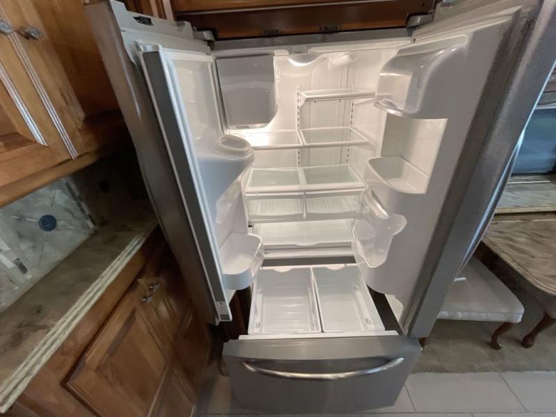 The road side slide out holds a sofa bed, booth dinette, overhead cabinets and a residential refrigerator. You may choose a u-shaped dinette, a dinette with computer workstation and/or an entertainment center with on leather lift recliner and flip table.
