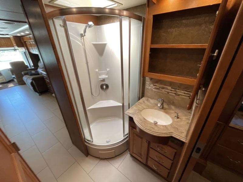 Moving forward, a split bath includes a vanity sink, overhead cabinet and shower on the curb side with a private toilet, vanity sink and overhead cabinet area on the other side.