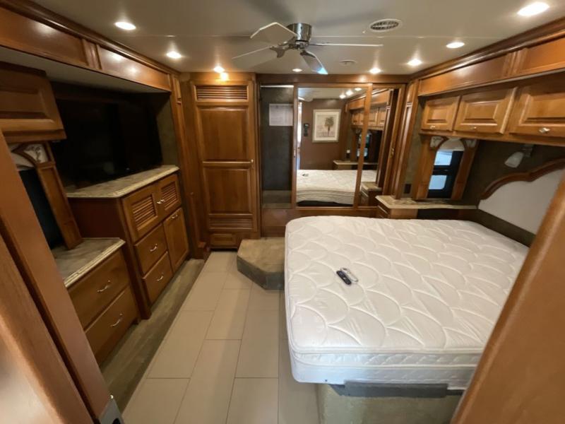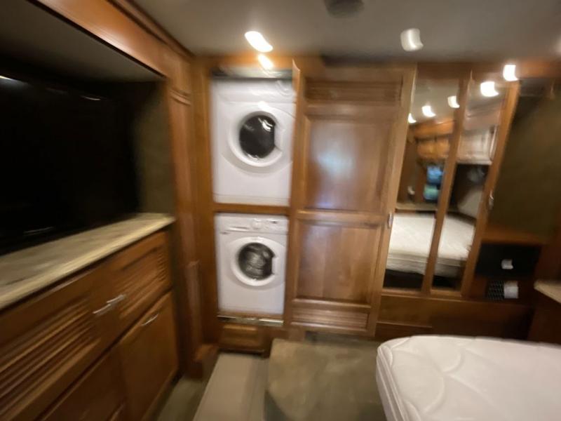 A rear master bedroom includes a queen size bed within a slide, nightstands at each side and overhead cabinets above. You may choose a king size bed for this room. The rear wall holds a closet and a corner closet for an optional washer/dyer. The wall opposite the bed includes a second bedroom slide out with an overhead TV, overhead cabinets and drawers below.